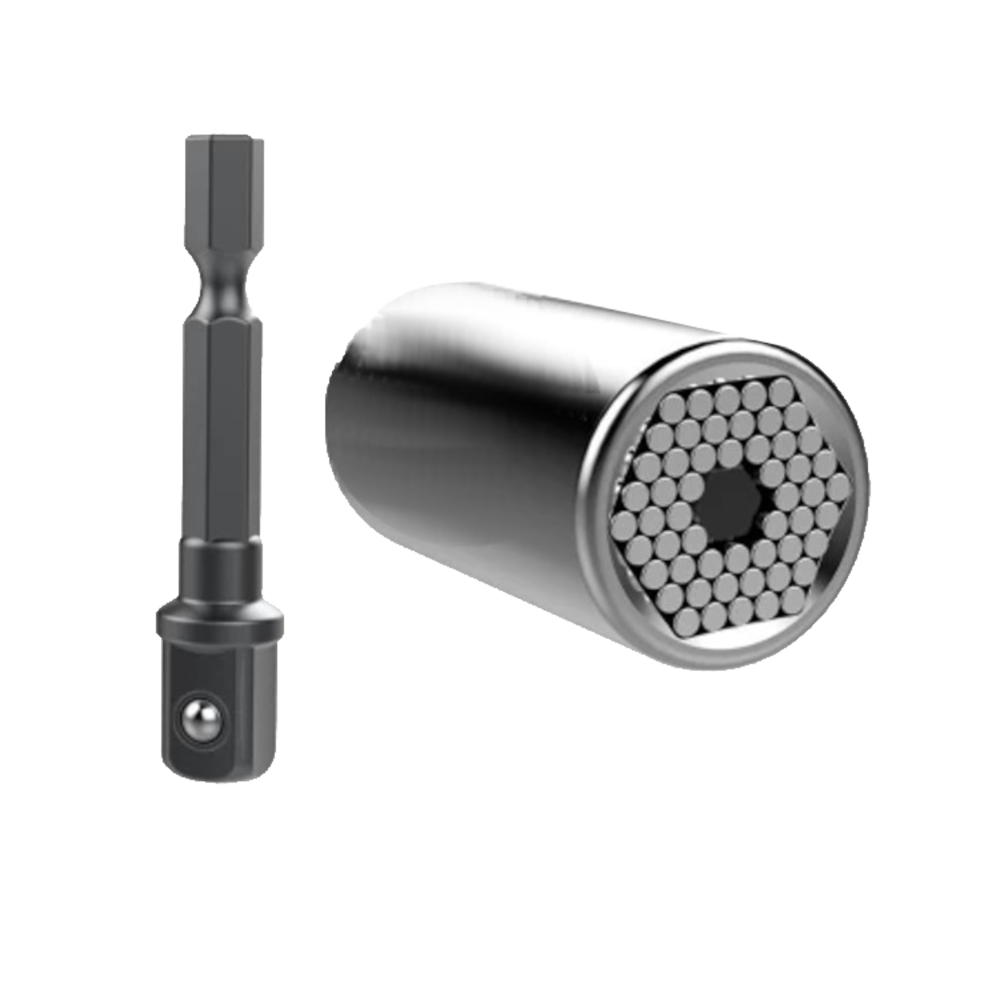 Universal Socket: The core component is a universal or 'magic' socket. It is constructed with numerous spring-loaded steel pins designed to conform instantly to the shape of the fastener.