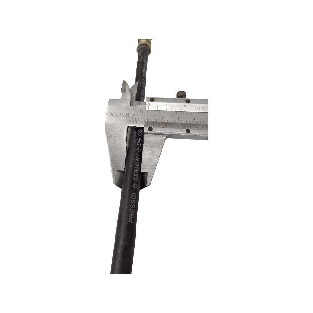 | Fittings | Threaded brass/gold-colored metal end fittings (male thread on both ends visible). |