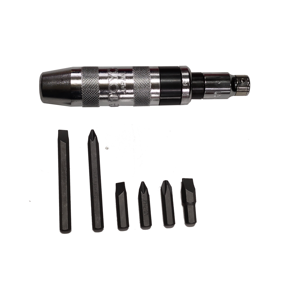 Driver: The set includes a heavy-duty impact driver body with a knurled metal grip and a 1/2-inch square drive for attaching bits.