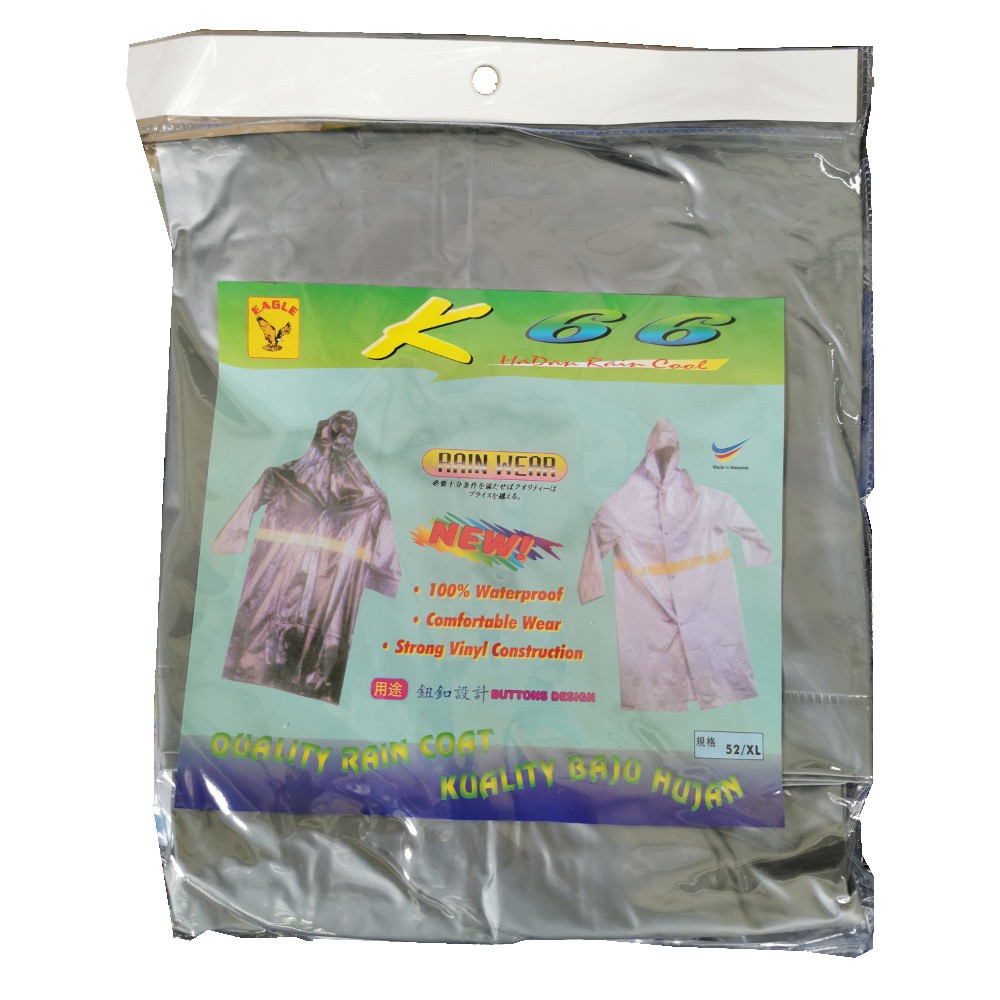 The Eagle K-66 is a heavy-duty, 100% waterproof silver raincoat designed for reliable protection during intense agricultural or outdoor work. Its durable construction is specifically tailored to withstand wet and windy environments.