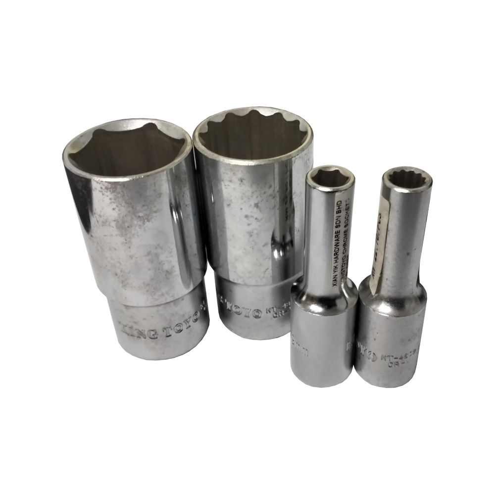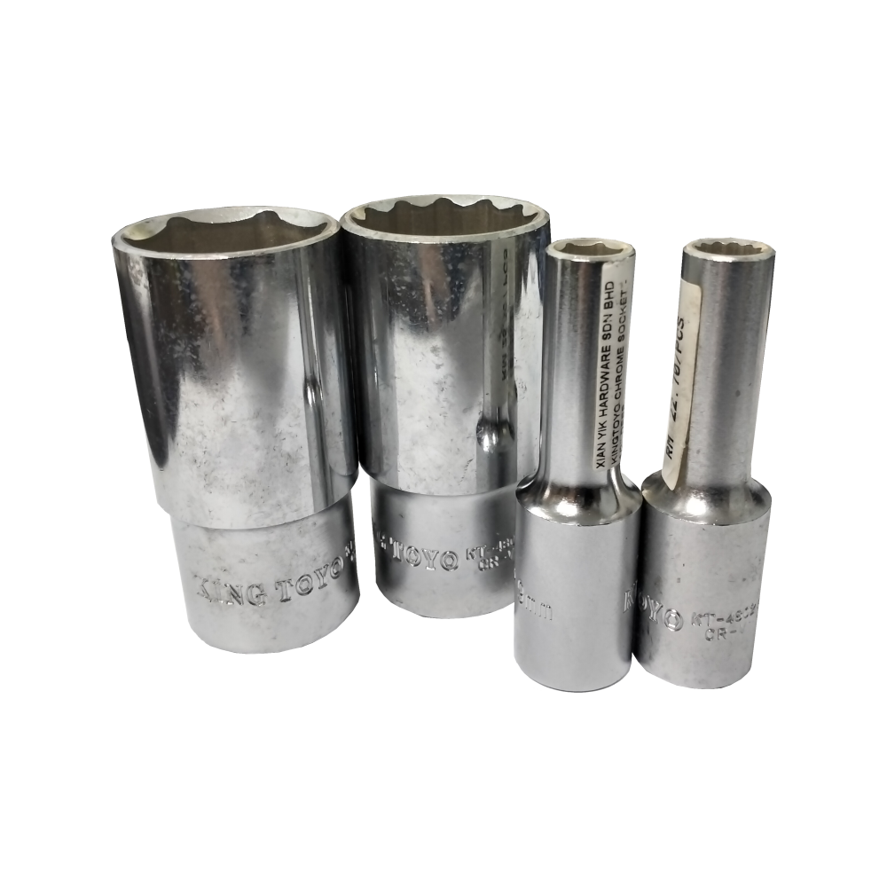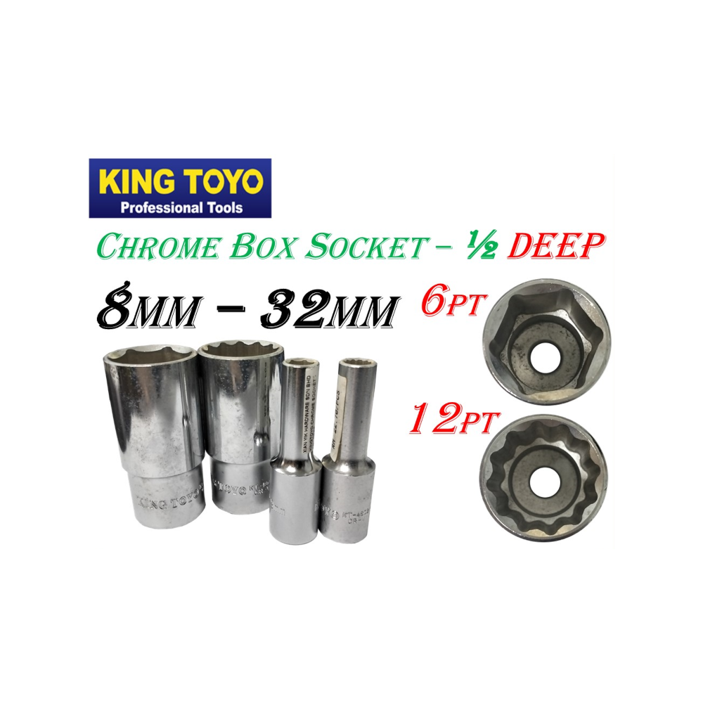 This is a versatile line of KINGTOYO Chrome Box Sockets, designed as a deep socket for accessing recessed fasteners. They are available for the 1/2-inch drive system and cover a range of metric sizes from 8 millimeters to 32 millimeters.