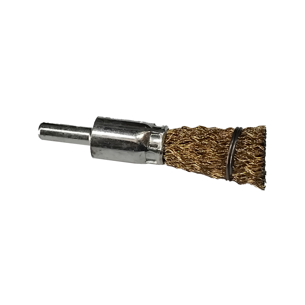 This brass-coated wire end brush is a precision abrasive tool specifically designed for cleaning and finishing in hard-to-reach areas. Unlike larger cup brushes, the end brush configuration allows for concentrated scrubbing action on recessed areas, internal corners, and small surface cavities.