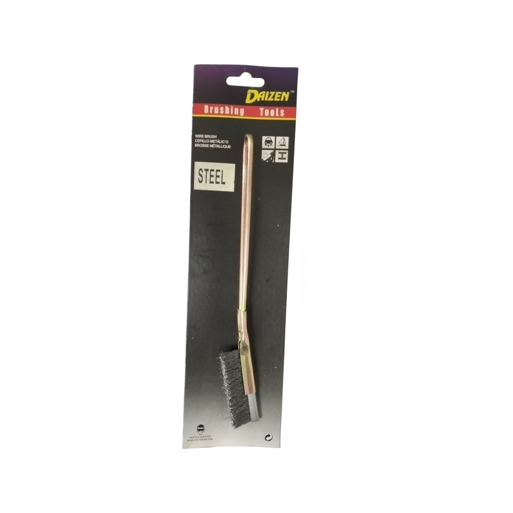 The Daizen Steel Wire Scratch Brush is a heavy-duty manual cleaning tool designed for aggressive surface preparation and material removal. It features high-tensile steel bristles secured to a durable, slim-profile metal handle, making it ideal for reaching into narrow gaps and cleaning stubborn debris from metallic surfaces.
