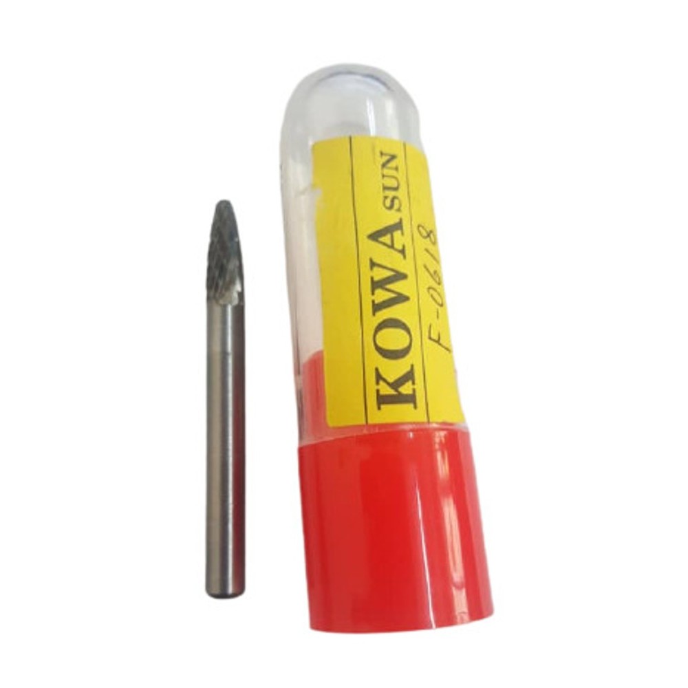 The KOWA SUN F Series TCT (Tungsten Carbide Tipped) Rotary Burrs feature a Tree with Radius End shape. This specific geometry combines a tapered body with a rounded tip, making it an essential tool for accessing tight, radiused areas and machining curved contours that standard cylindrical burrs cannot reach.