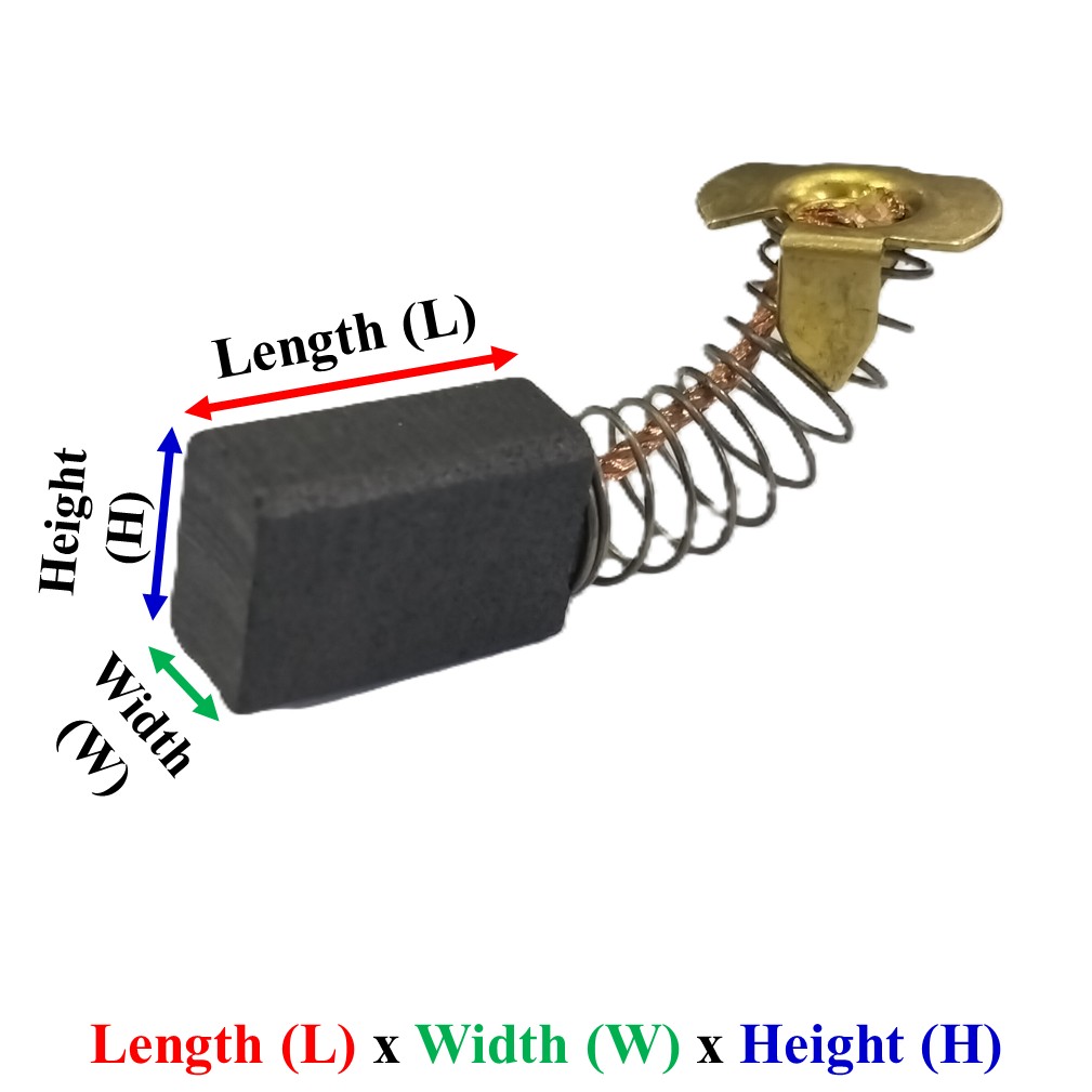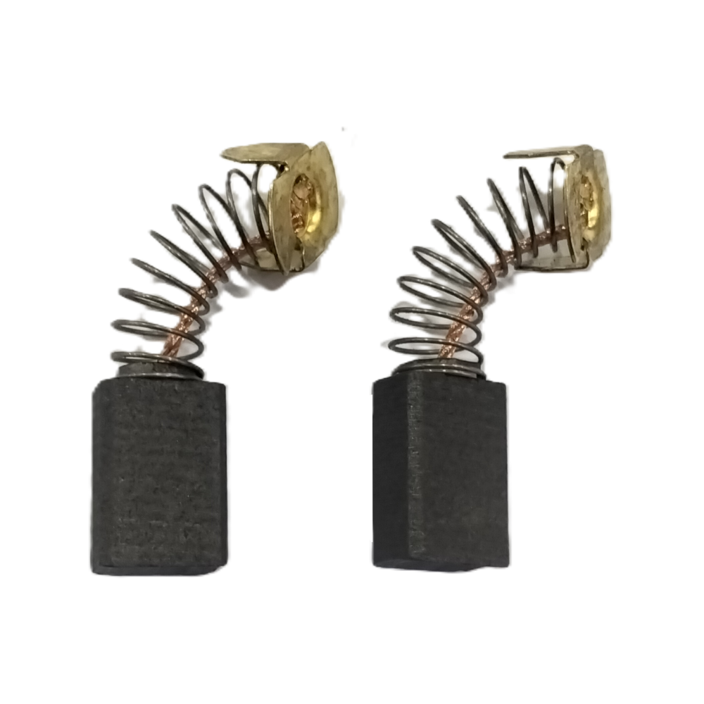 Construction: The brushes are rectangular blocks of carbon material, featuring a coiled spring mechanism and a brass or metallic terminal cap for electrical connection.