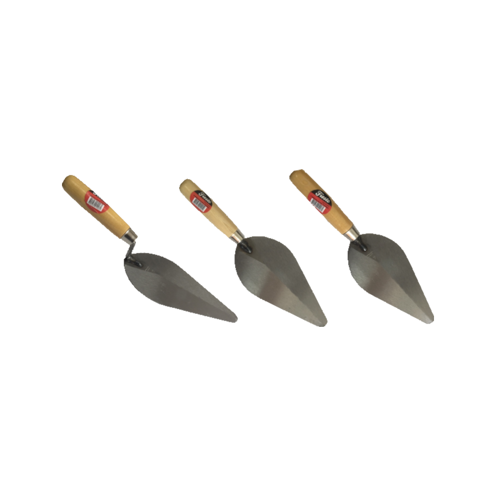 This is a selection of professional-grade bricklaying trowels, essential for efficiently scooping, spreading, and leveling mortar in various masonry applications. The design follows the classic London Pattern, offering excellent balance and material-carrying capacity.
