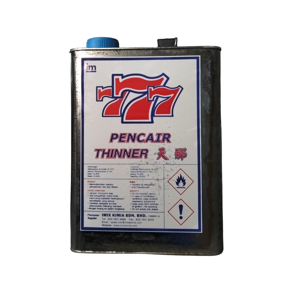 The T777 Thinner is a General Purpose (GP) Thinner marketed for household and DIY (Do-It-Yourself) use, as opposed to industrial-grade thinners. It is a highly effective solvent blend designed for oil-based coatings.