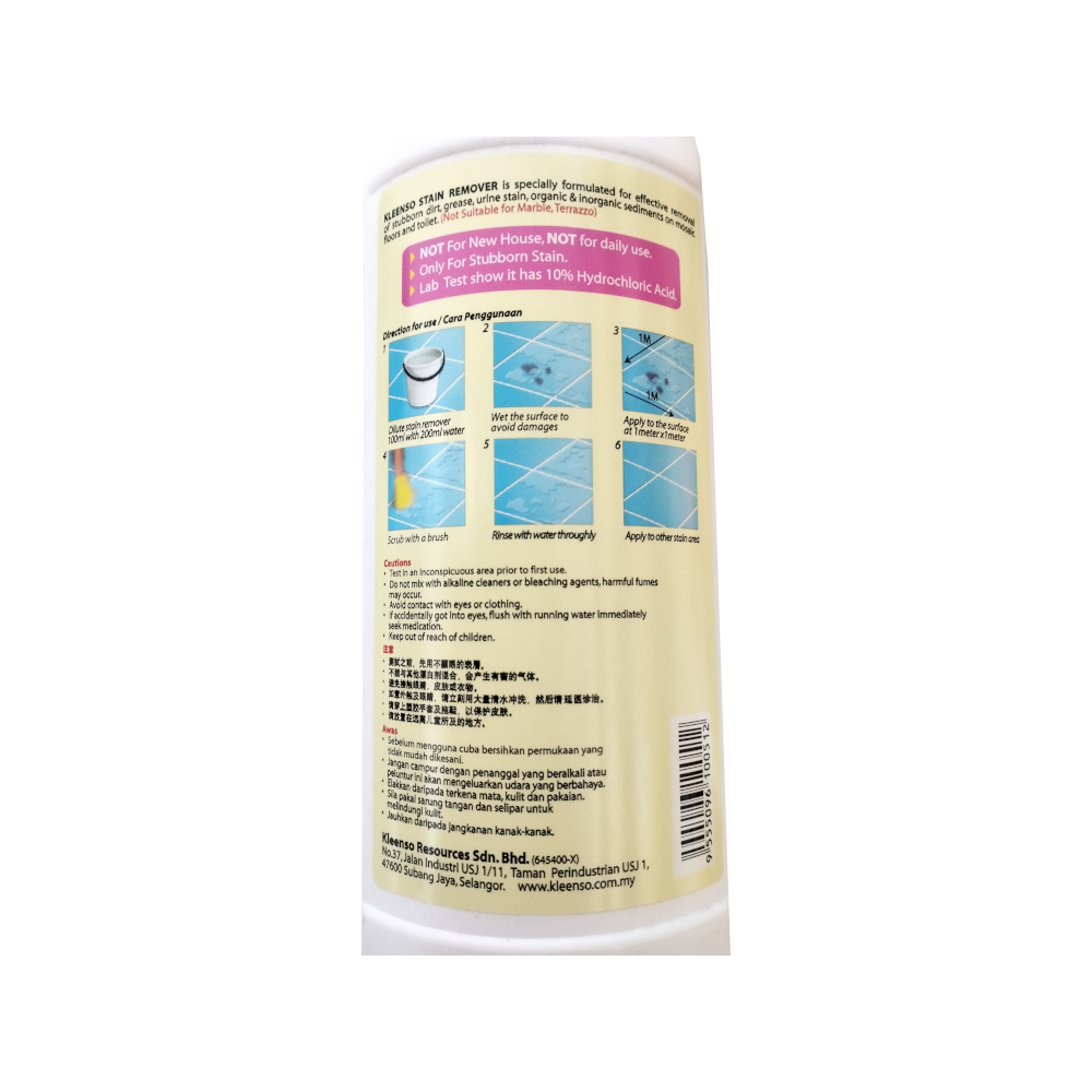 Kleenso Concentrated Stain Remover for mosaic & toilet is specially formulated for effective removal of stubborn dirt, grease, urine stain, organic & inorganic sediments on mosaic floors and toilet. (Not suitable for Marble, Terrazzo)