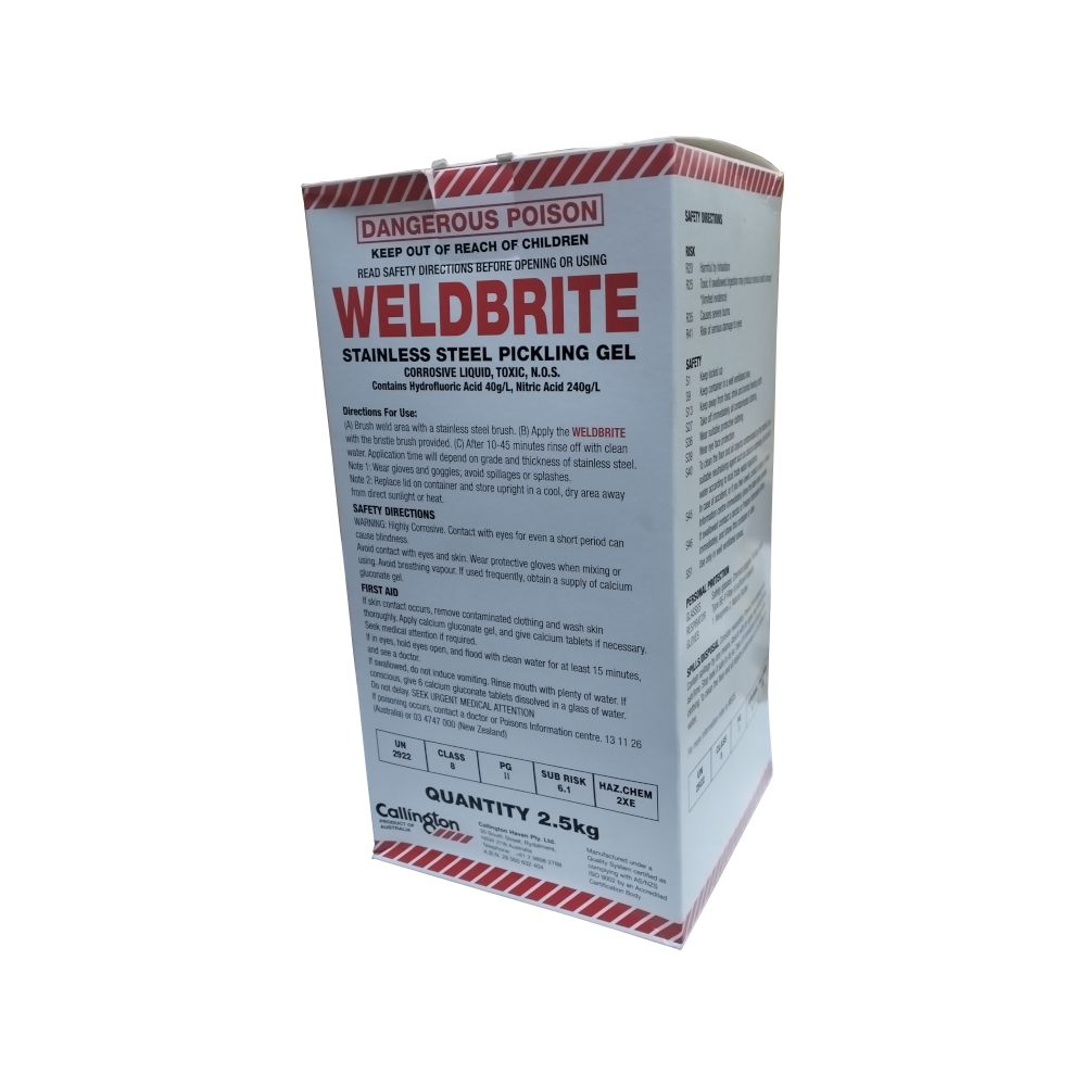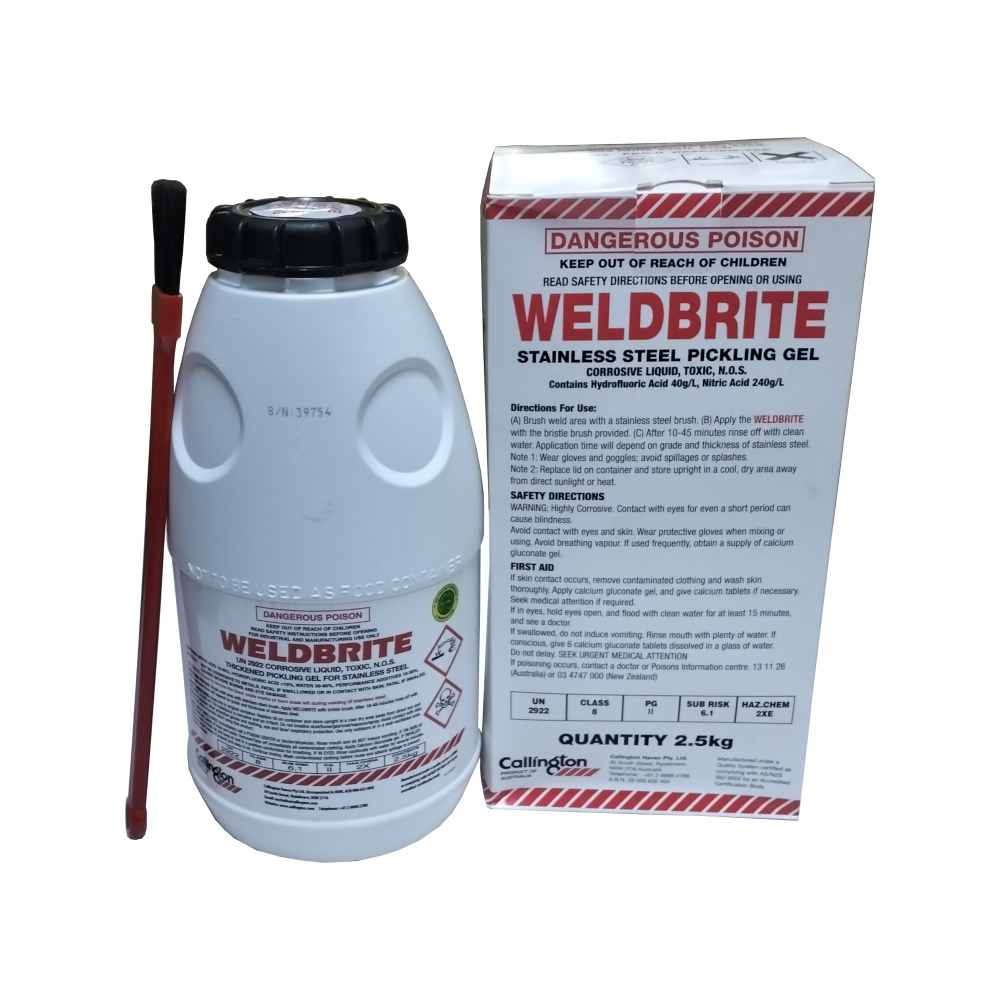 4. Apply the Weldbrite gel to the area to be cleaned, using the brush provided or with an acid resistant spray pump and applicator. DO NOT PICKLE IN DIRECT SUNLIGHT.