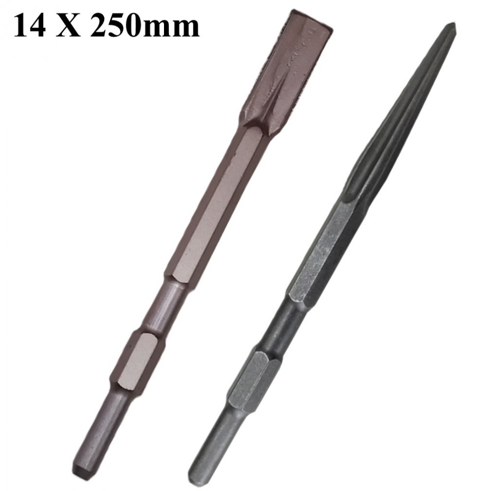 This is a professional two-piece set of chisel bits designed for demolition and breaking work in medium-to-heavy masonry materials. Featuring a 17mm Hexagon (Hex) Shank, these chisels are compatible with heavy-duty chipping hammers and demolition breakers that utilize this widely recognized shank system. The brown and dark-coated finishes suggest different steel grades or protective treatments.