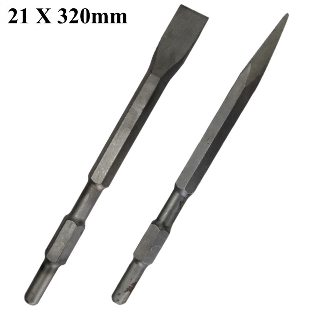 This is a professional two-piece set of heavy-duty power tool attachments designed for intensive demolition and breaking tasks in concrete, masonry, and stone. These chisels utilize the large 21mm Hexagon (Hex) shank system, making them compatible with powerful demolition and rotary hammers.