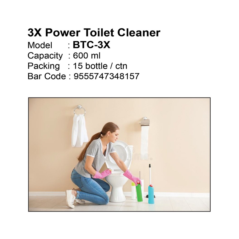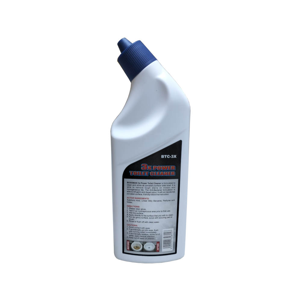BOSSMAN 3x Power Toilet Cleaner is formulated to clean and shine all porcelain surface toilet bowl. It is able to remove tough stains on mosaic and homogeneous tile. The Anti-Bacterial formulation is able to kill germ and dispel odour. It will not decolorize porcelain surface, if strictly follow the instruction.