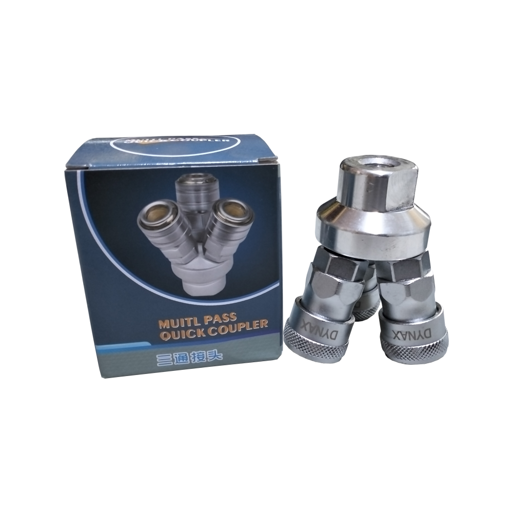 Description: 3-way air quick coupler to connect up to three air hoses simultaneously.