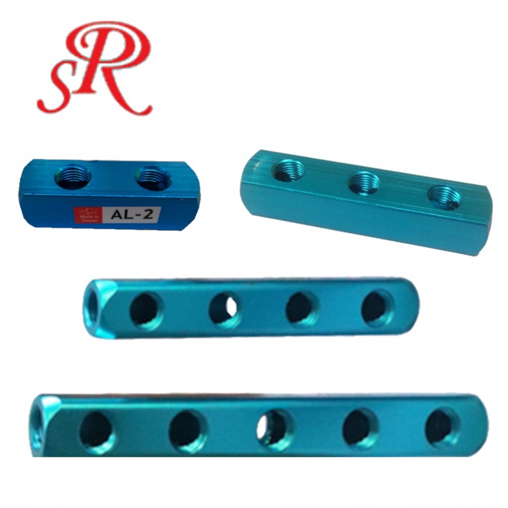 This product is a SUN-RISE AL series air hose manifold block (sometimes called a coupler base or splitter bar). It is a passive distribution block designed to split a single air supply line into multiple female threaded ports, allowing users to customize their multi-pass quick coupler setup by screwing in individual quick-connect sockets or other fittings.