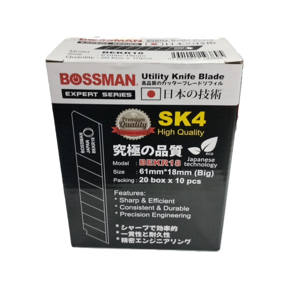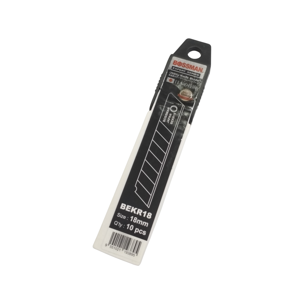 The BOSSMAN Expert Series BEKR18 is a set of high-quality, segmented snap-off utility knife blades designed for precision cutting and durability. Marketed under the "Expert Series" and utilizing Japanese technology, these blades are ideal for professional use in construction, DIY, crafting, and general purpose cutting.