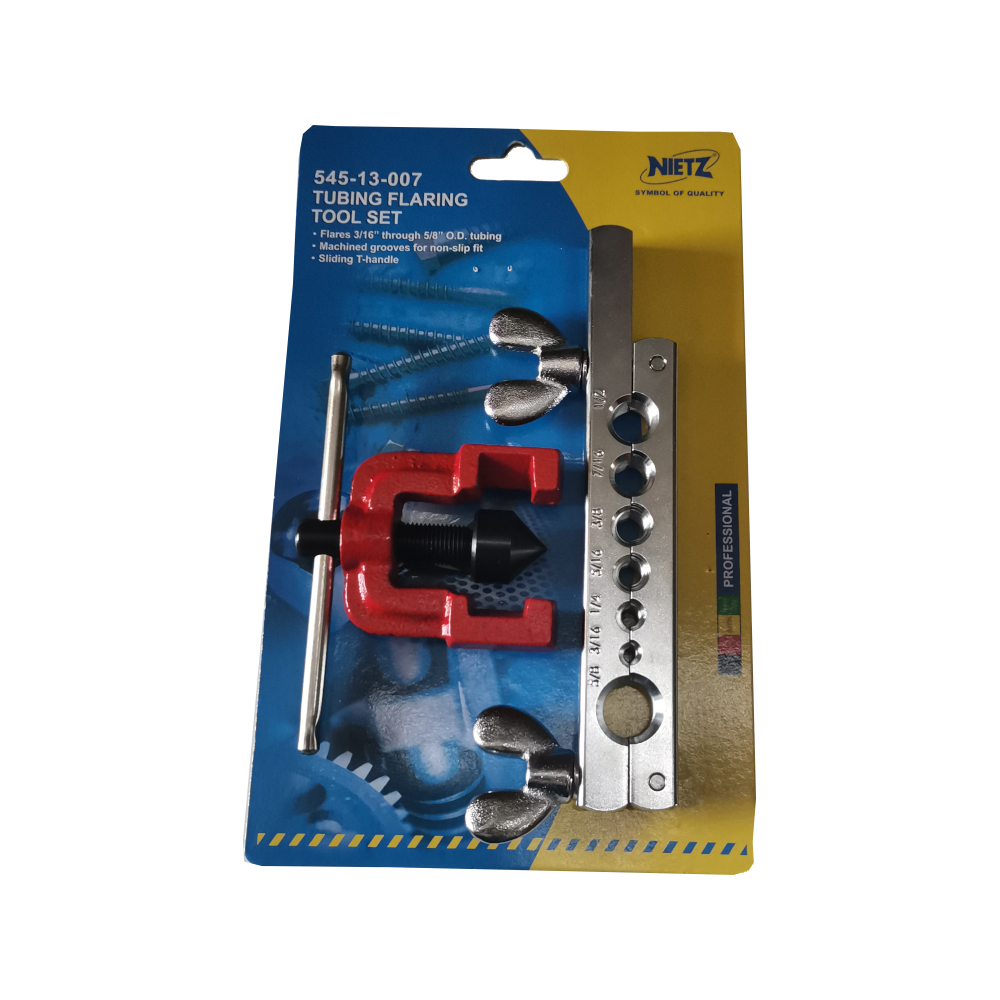 The NIETZ Tubing Flaring Tool Set (545-13-007) is a specialized kit for professionals in the automotive, air conditioning, and plumbing industries. It is used to create flares on the ends of tubing for a secure, leak-free connection.