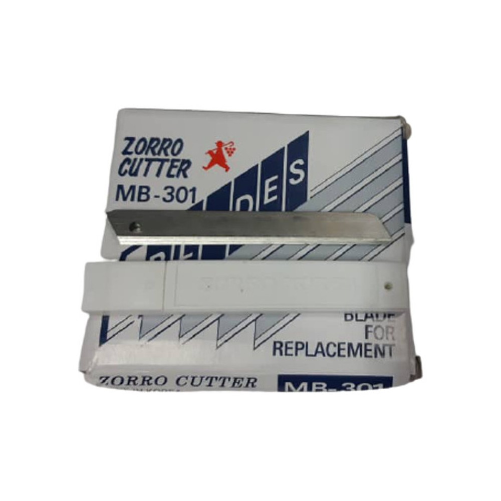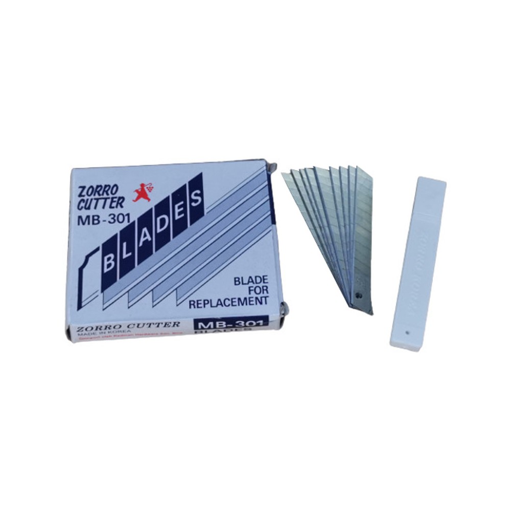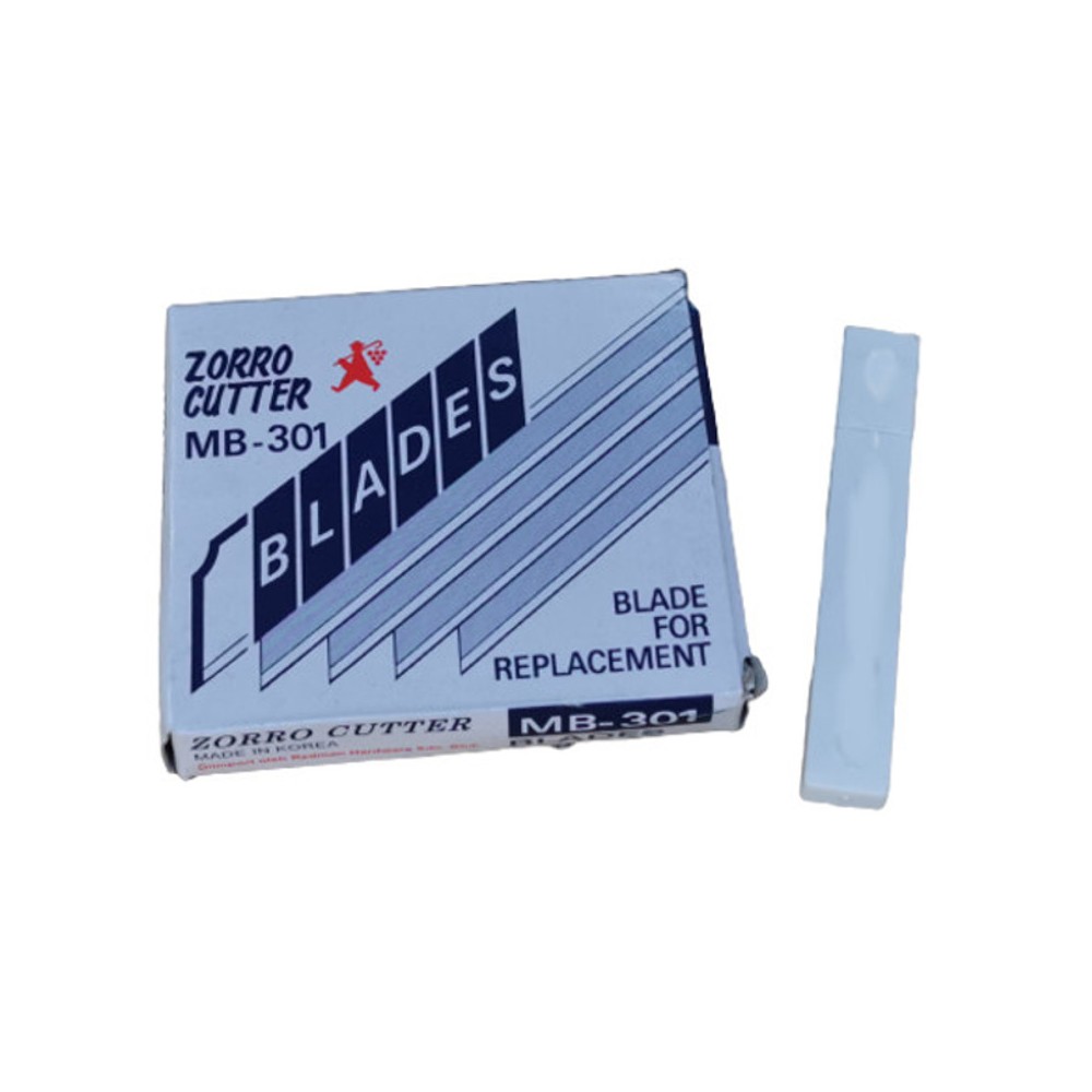 The MB301 ZORRO CUTTER BLADE 9mm (S) MADE IN KOREA (1CARD X 10PCS) is a pack of snap-off replacement blades for use in small utility knives.