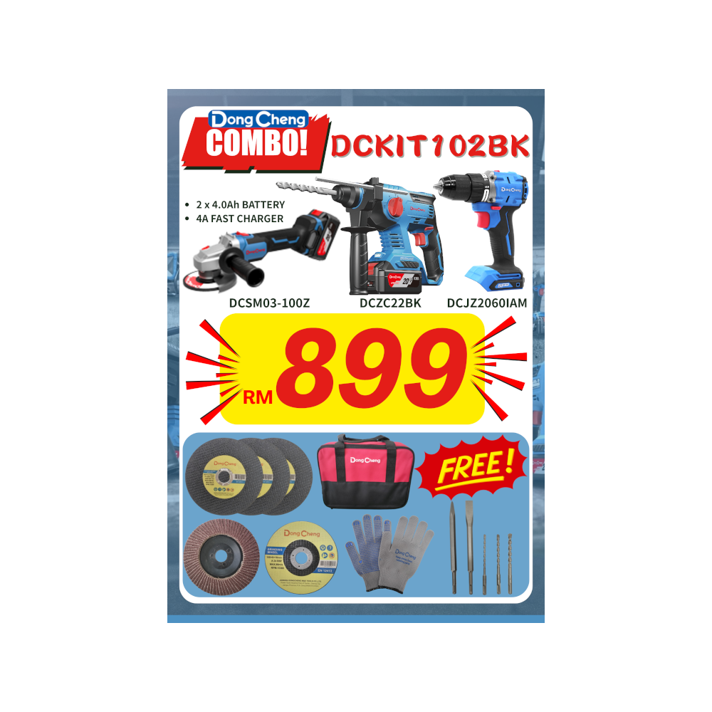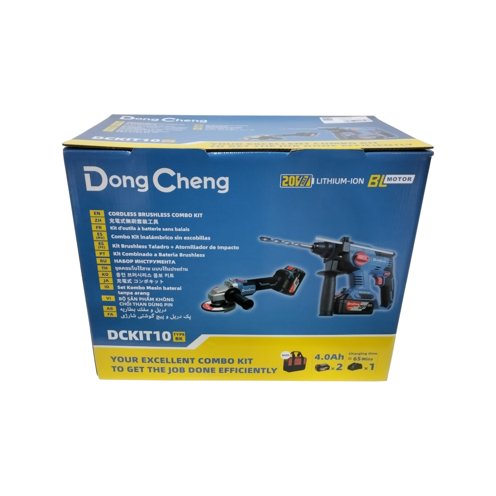 Dong Cheng DCKIT10BK 20V Cordless Brushless Combo Kit Typical Kit Components: 1 x DCZC22 Cordless Brushless Rotary Hammer (Solo/Machine...