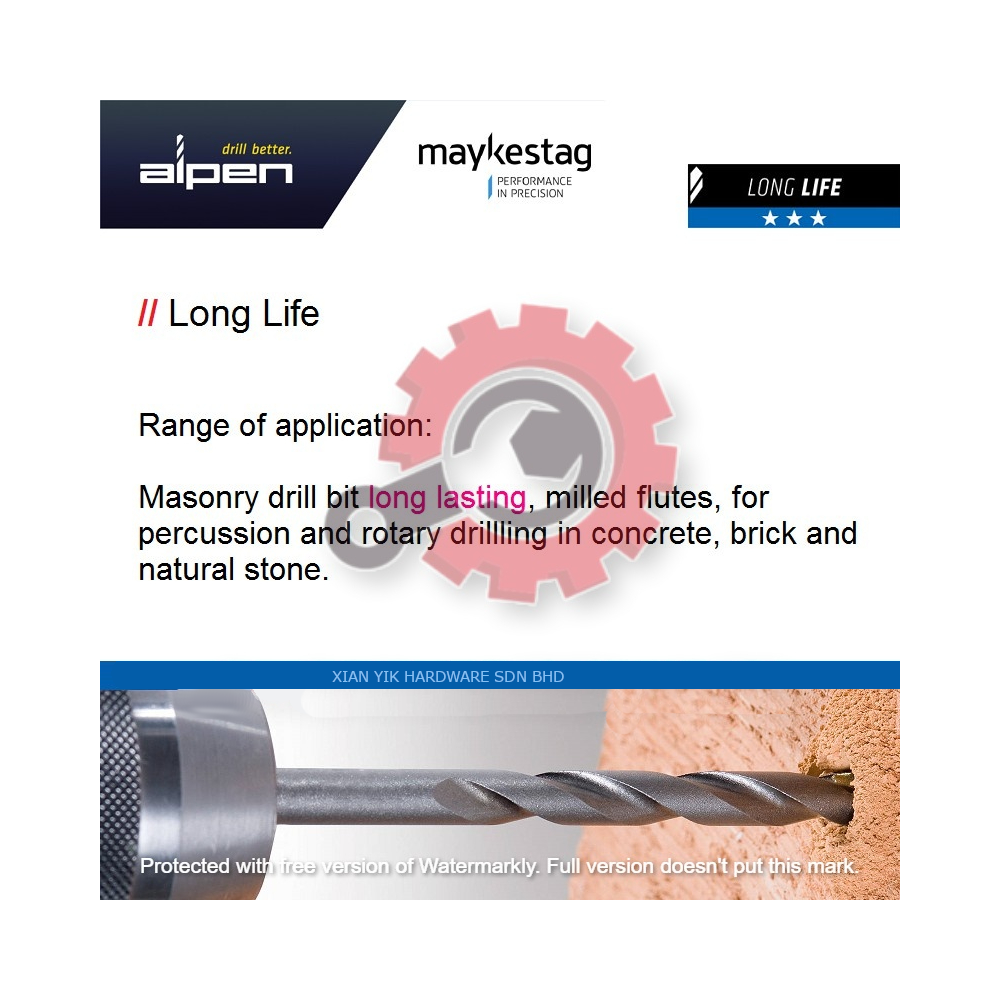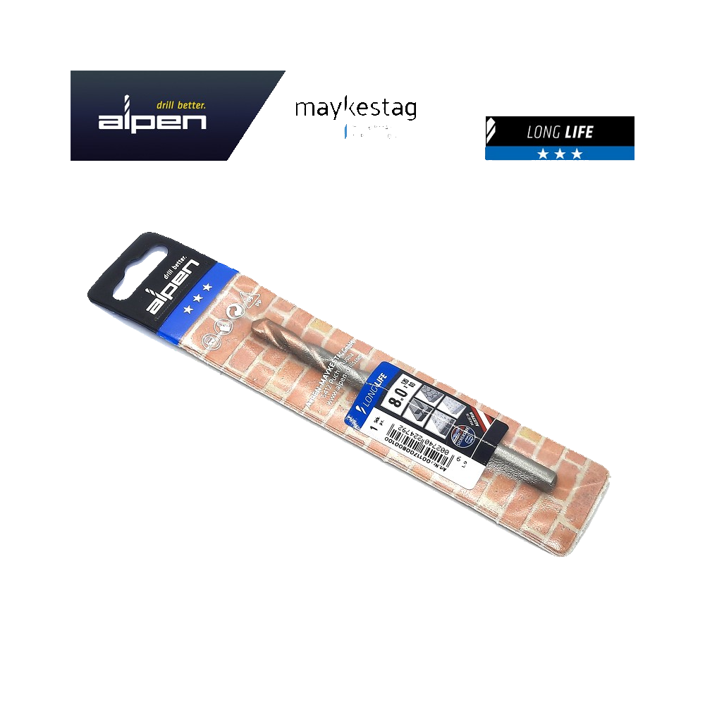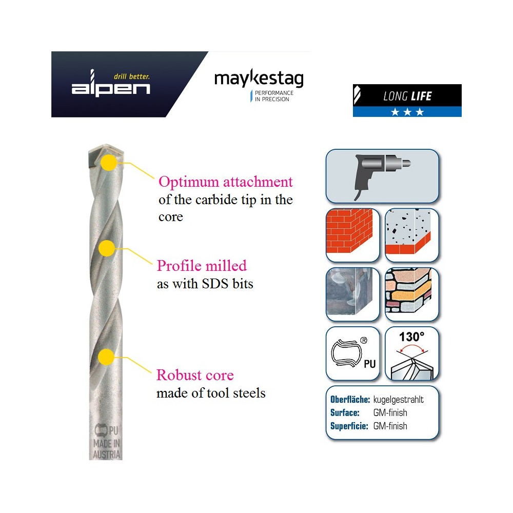 High quality masonry drill bit type long lasting and milled flutes for percussion and rotary drilling in concrete, brick and natural stone. Very strong drilling core allows ultimate drilling experience even in tough condition.