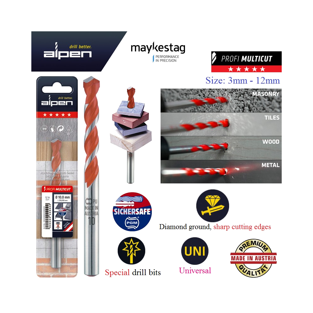 The Alpen Profi Multicut is a high-performance, universal drill bit designed for precision across multiple materials. Manufactured in Austria by Maykestag, these bits are engineered to provide "drill better" performance with professional-grade quality. The series features a distinctive red spiral design and is built to be a truly universal solution for various drilling tasks.