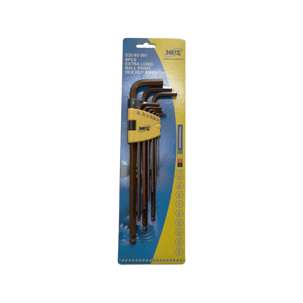 The NIETZ 532-94-501 Long Ball Point Hex Key Set is a professional-grade set of imperial (SAE) hex (Allen) wrenches. The "ball point" feature is a key characteristic, as it allows the user to insert the wrench into the screw at an angle, making it useful for working in tight or difficult-to-reach spaces.