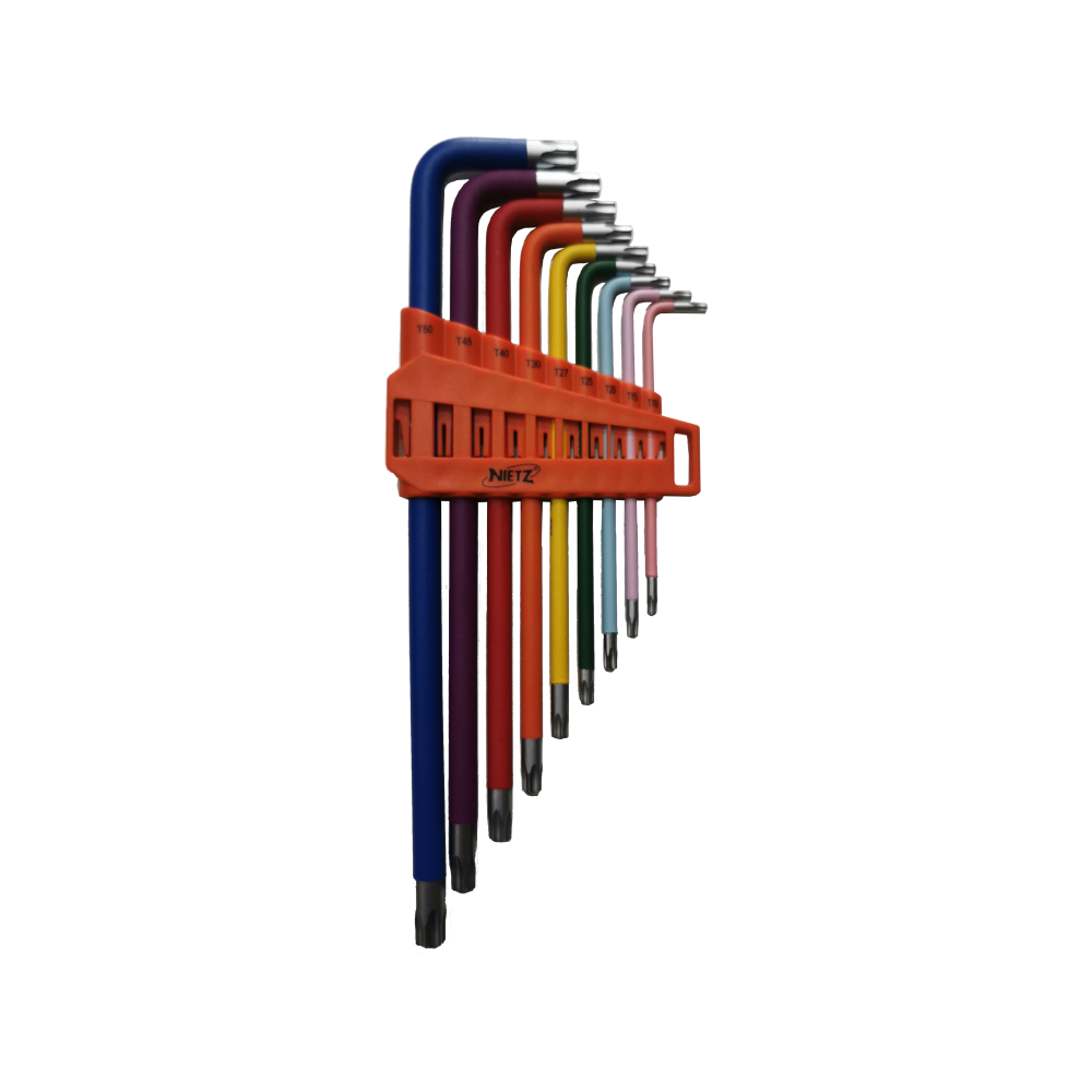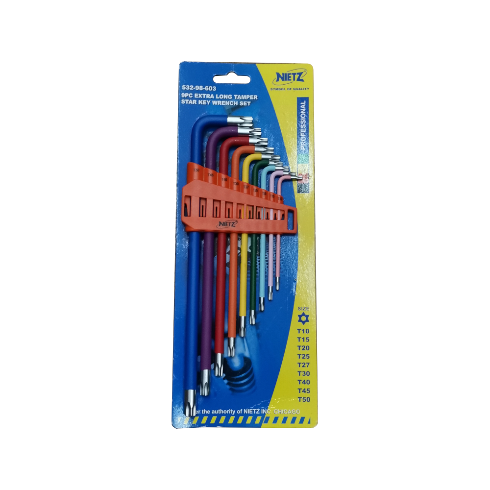 The NIETZ 532-98-603 Extra Long Magnetic Torx Wrench - Rainbow is a professional-grade set of metric Torx key wrenches. This product is distinct for its tamper-proof design, magnetic feature, and a unique, multi-colored finish.