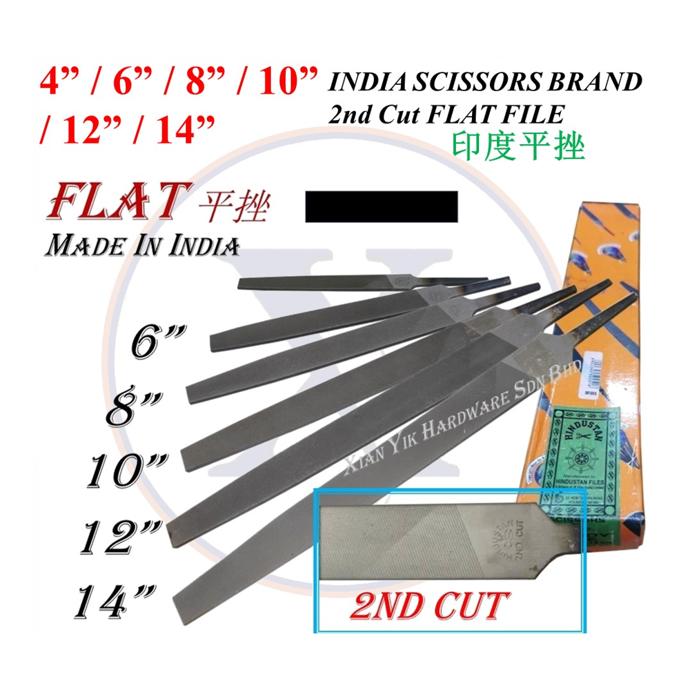 This is a high-quality flat steel hand file from the INDIA SCISSORS BRAND (Hindustan Files), featuring the general-purpose 2nd Cut coarseness.