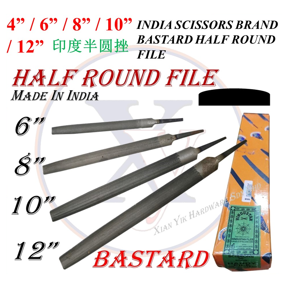 This is a versatile, professional-grade half-round steel hand file from the INDIA SCISSORS BRAND (Hindustan Files), featuring the aggressive Bastard Cut coarseness.