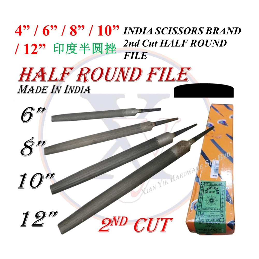 This is a versatile, professional-grade half-round steel hand file from the INDIA SCISSORS BRAND (Hindustan Files), featuring the general-purpose 2nd Cut coarseness.