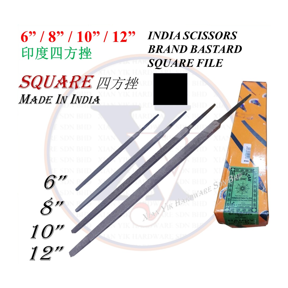 This is a professional-grade square steel hand file from the INDIA SCISSORS BRAND (Hindustan Files), featuring the aggressive Bastard Cut coarseness.