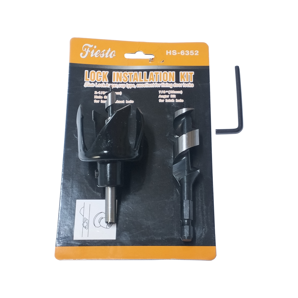 The FIESTO Lock Installation Kit is a specialized 2-piece woodworking set designed to take the guesswork out of installing standard cylindrical door locks. This kit provides the two essential hole saw sizes required for a professional fit: a large diameter for the lockset body and a smaller diameter for the latch bolt hole.