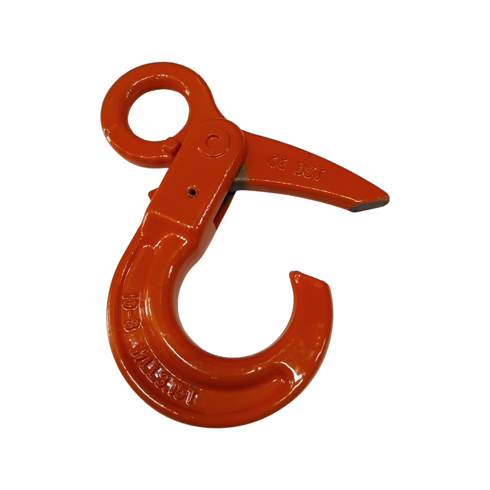 The GR80 SLE Series is a professional-grade lifting component engineered for maximum safety in overhead lifting and rigging applications. These hooks feature a self-locking mechanism that automatically closes and locks when a load is applied, ensuring the hook cannot open under tension. The swivel eye design allows the hook to rotate 360 degrees, helping to align the load and preventing the lifting chain or wire rope from twisting. Manufactured from high-tensile Grade 80 (GR80) alloy steel, these hooks are finished in high-visibility orange powder coating.