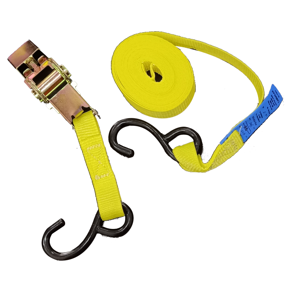 Design: Features a metal ratchet mechanism for tightening and two S-hooks for securing the strap ends to anchor points.