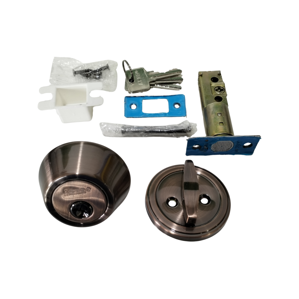 The AERO A3011-AC Single Dead Bolt Lock is a classic and robust security device designed to supplement or enhance the security of a door. It features an Antique Colour (AC) finish, giving it a rich, traditional appearance. This is a single cylinder deadbolt, meaning it is operated by a key from the exterior and a thumb-turn knob from the interior.