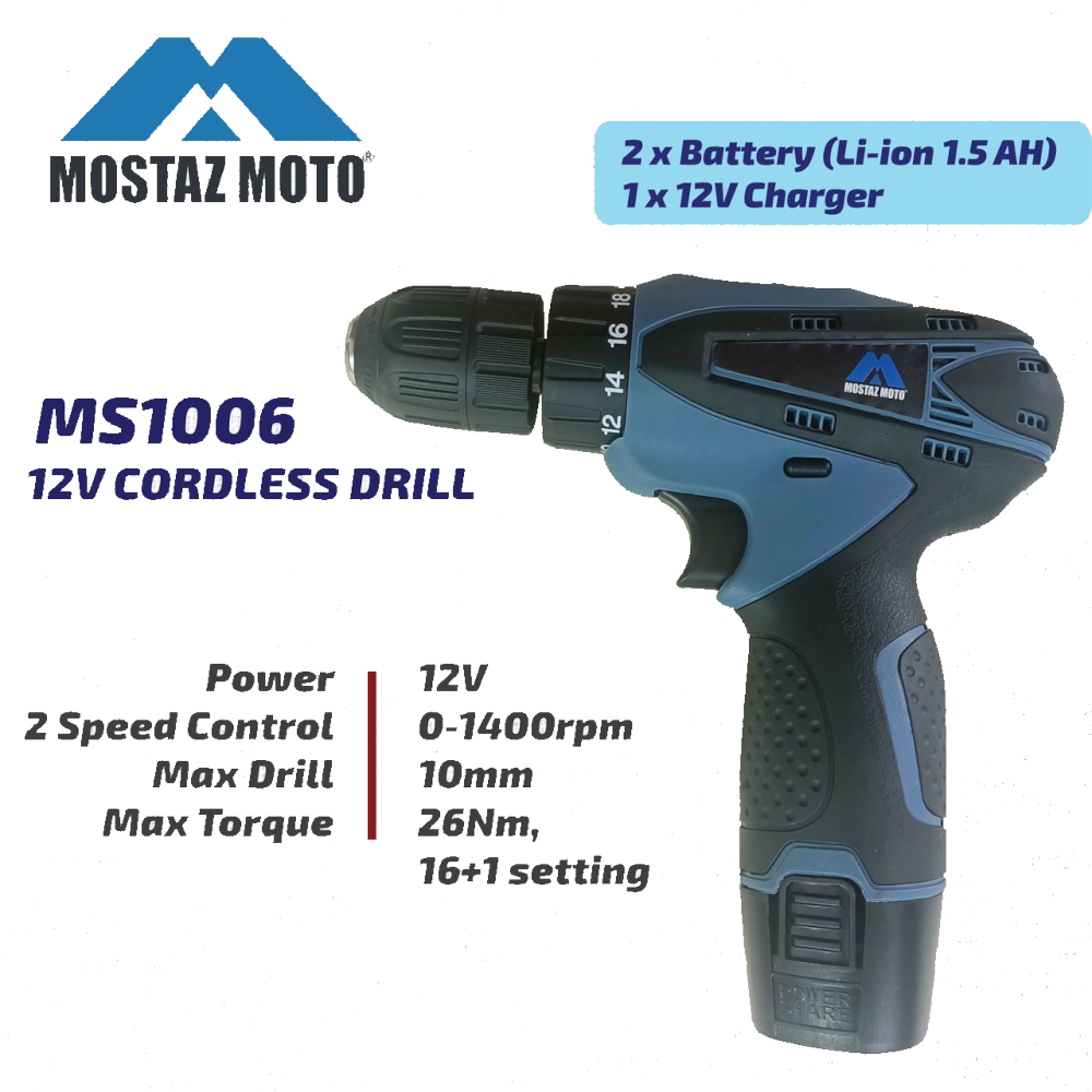 The NEW MOSTAZ MS-1006 12V Cordless Drill is a powerful and compact tool perfect for your drilling and screwdriving needs. It delivers up to 26Nm of Max Torque and features 2 Speed Control with a maximum speed of 1400rpm. The kit comes complete with 2x Li-ion 1.5Ah Batteries and a 1x 12V Charger, ensuring minimal downtime. A versatile 16+1 torque setting allows for precision in a wide range of materials, with a 10mm Max Drill capacity. Get reliable power and control with the MS-1006!