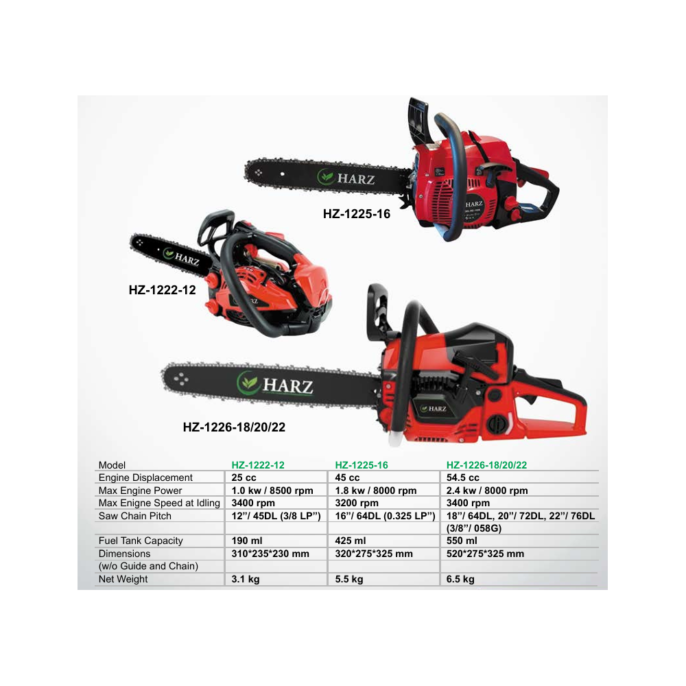Heavy-Duty Build: The HZ1226 series offers a significantly higher power output (2.4KW) and a larger fuel tank, making it better suited for thicker logs and professional use.
