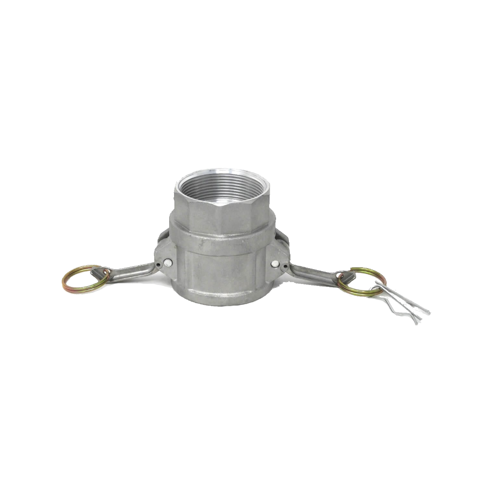 The Type D Camlock Coupler is a female coupler designed for threaded pipe connections. It features a female camlock end with dual locking levers on one side and a female BSP/NPT thread on the other. This allows it to be screwed directly onto a male threaded pipe or nipple, providing a quick-connect point for male adapters (Type A, E, or F). It is commonly used in industrial pumping, irrigation, and fluid transfer systems.