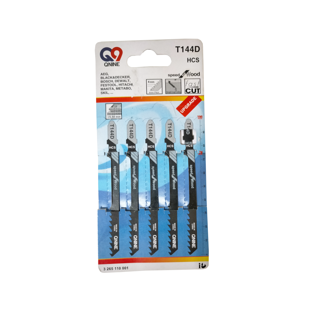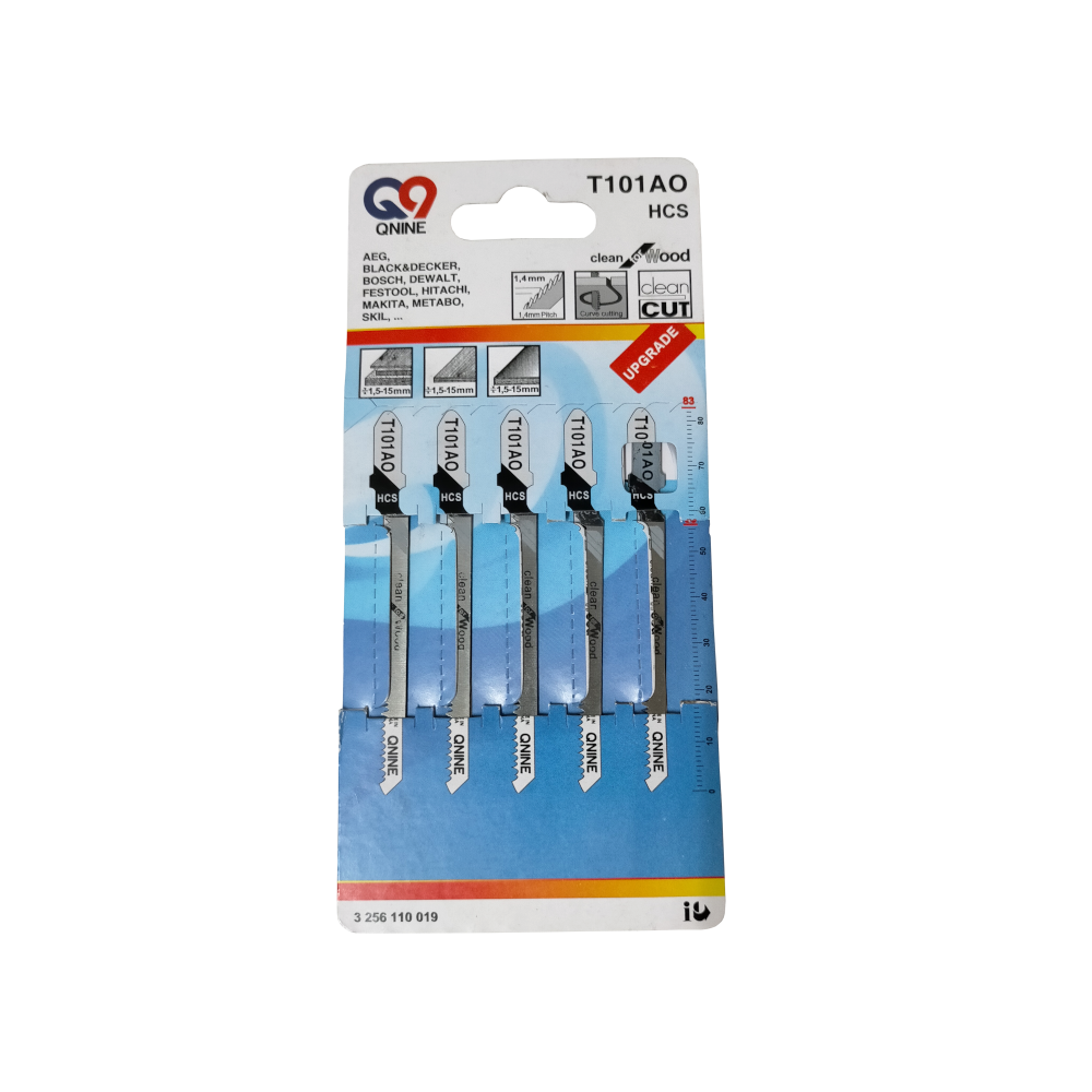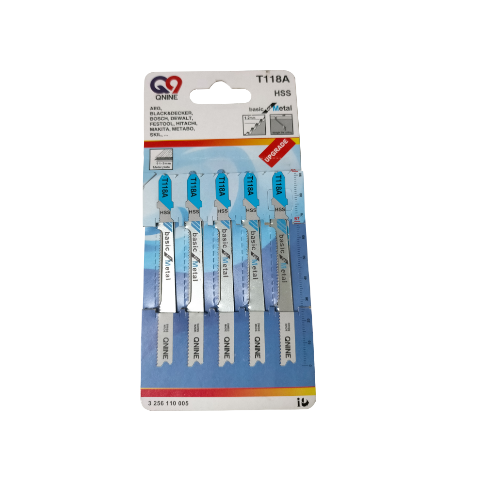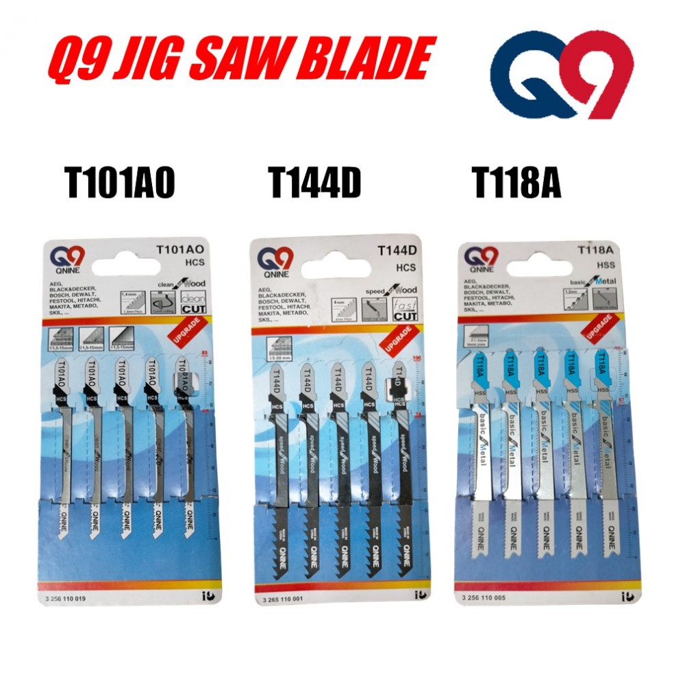 In summary: A "Q9 Jigsaw Blade" is not one specific blade. It is a brand that packages and sells a variety of standard jigsaw blades for different materials and cut types (e.g., clean wood cuts, fast wood cuts, or metal cuts).s, fast wood cuts, or metal cuts).