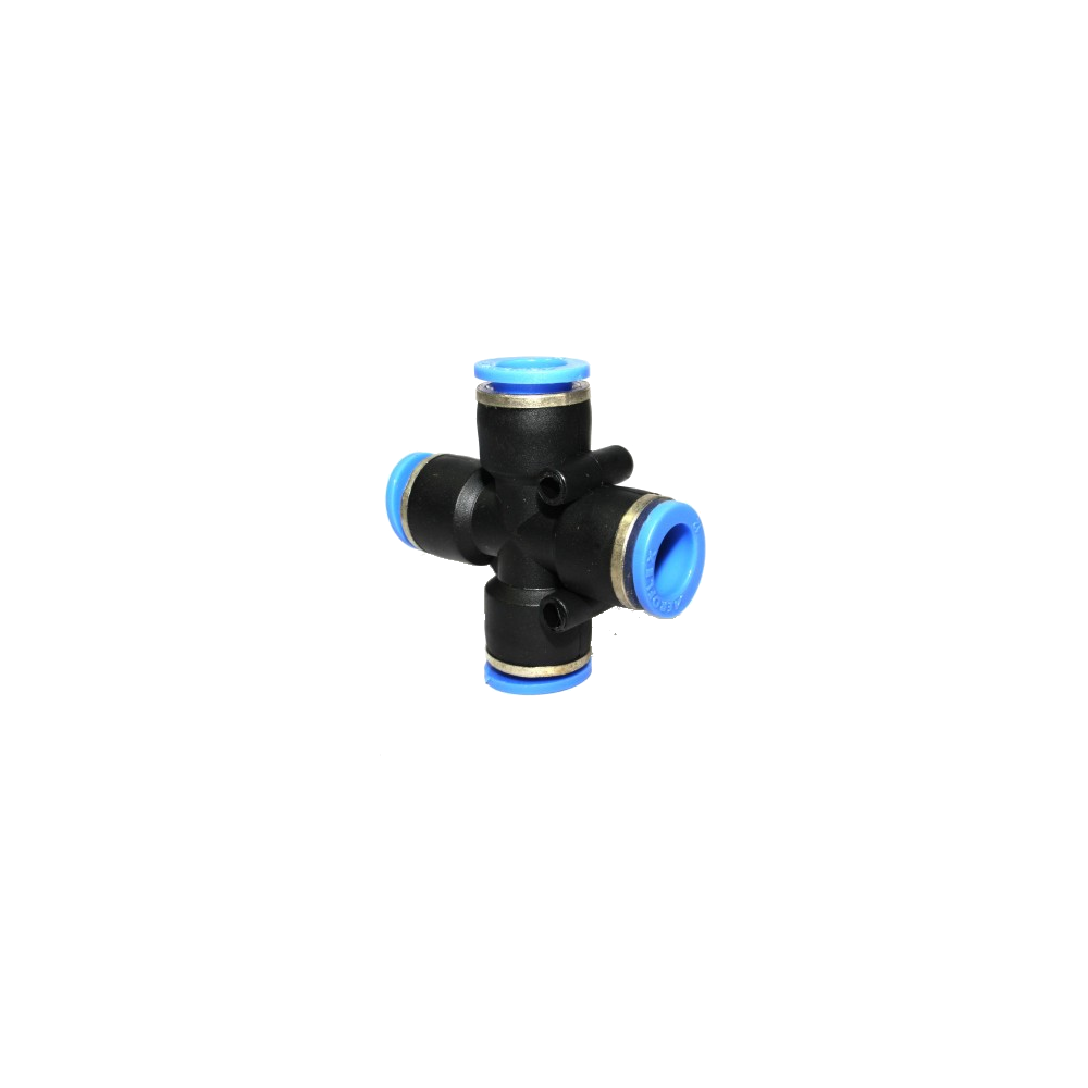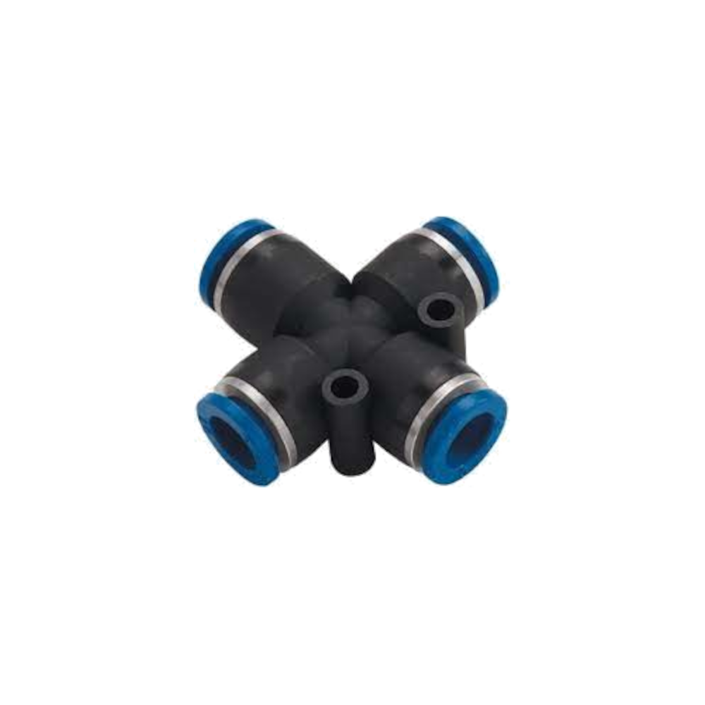 The SPZ Union Cross fitting (often categorized as the PK or PX series equivalent) is a specialized, four-port push-in connector designed for centralized distribution and merging of pneumatic air lines. This fitting is used to connect four tubes of the same outer diameter (OD) at a central point, making it highly effective for complex, compact air distribution manifolds.