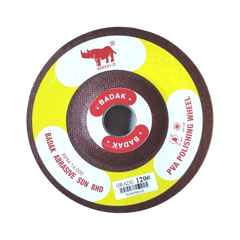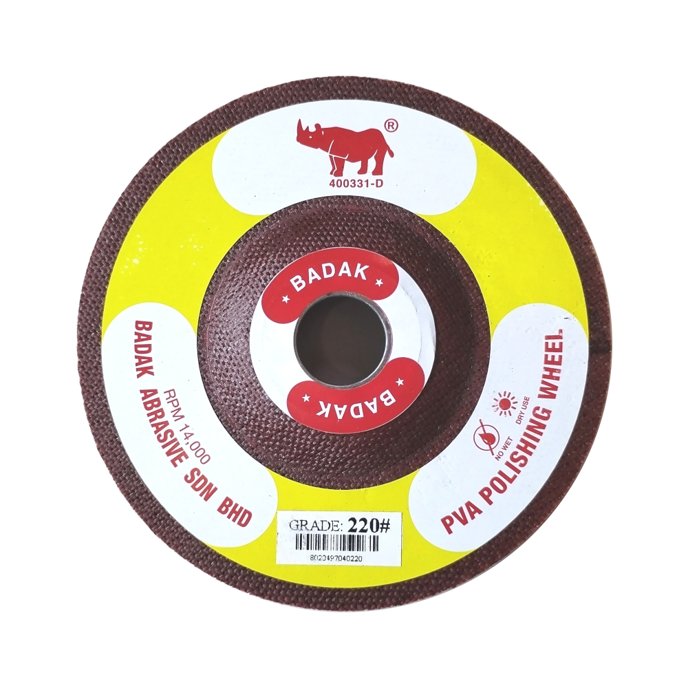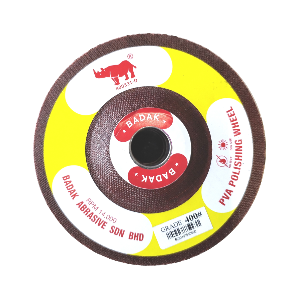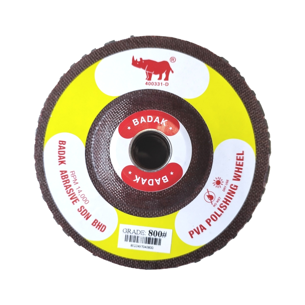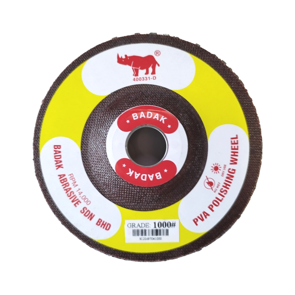 A high-quality, 100% original PVA polishing wheel from BADAK Abrasive, designed for a variety of polishing tasks. This durable wheel comes in a comprehensive range of grit sizes, from G80 (coarse) up to G1000 (fine), making it suitable for material removal, surface preparation, and achieving a smooth, professional finish.