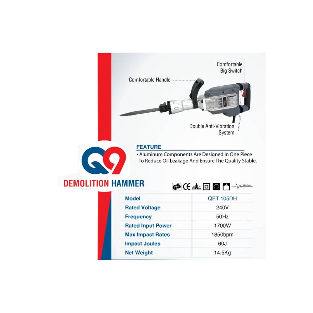 The Q9 QET105DH is a heavy-duty corded electric demolition hammer, also known as a jackhammer or concrete breaker.