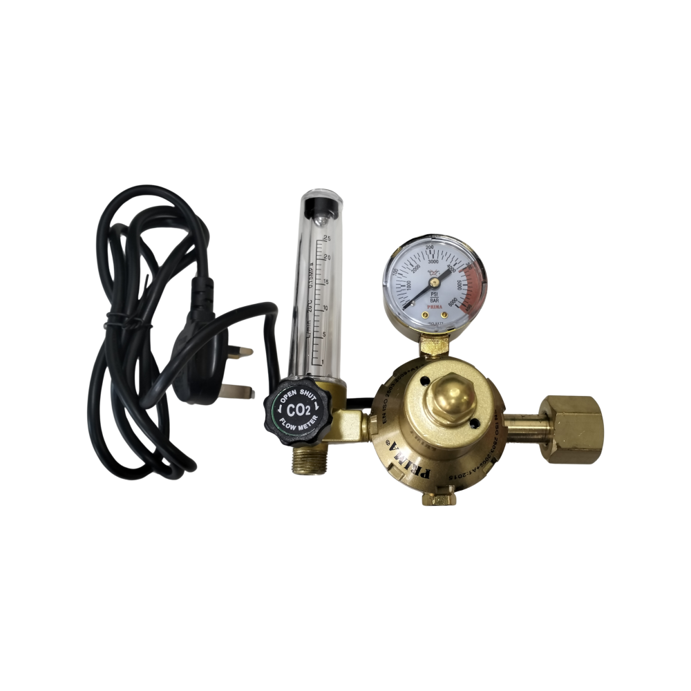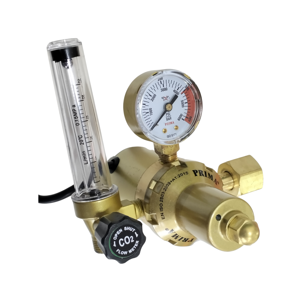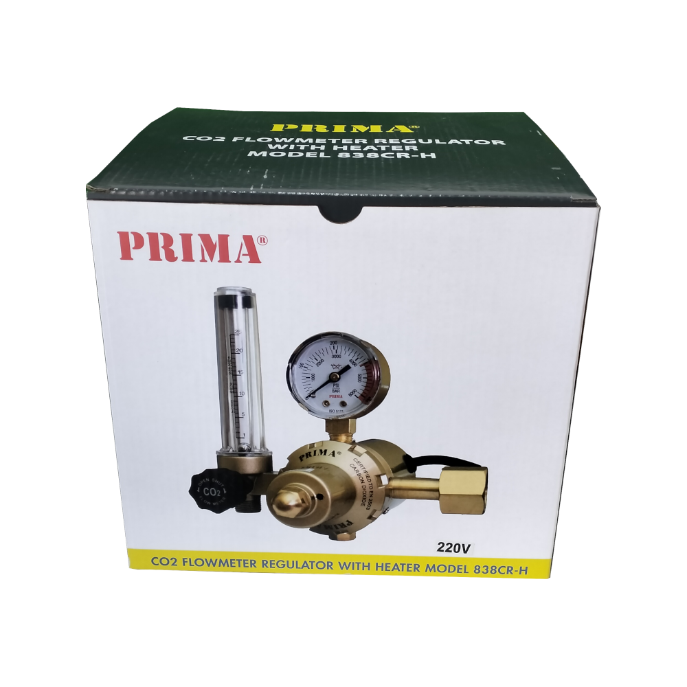 The PRIMA CO2 Flowmeter Regulator with Heater Model 838CR-H is a specialized device used to control the pressure and measure the flow rate of carbon dioxide CO2 gas, typically in applications like MIG/TIG welding (as a shielding gas regulator) and beverage dispensing systems.