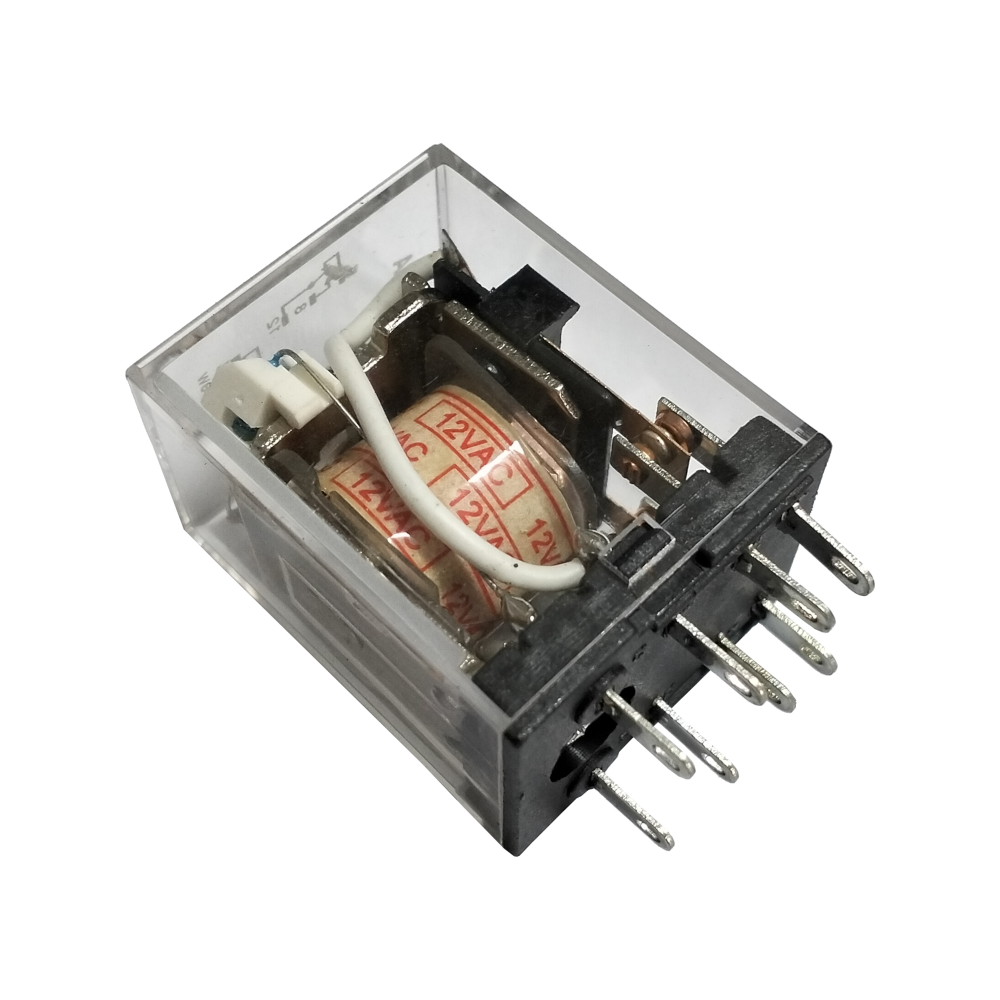 This relay utilizes a 2-row (8-pin) configuration, providing two sets of changeover contacts for versatile circuit management. It is designed for plug-in mounting, compatible with standard relay bases/sockets.