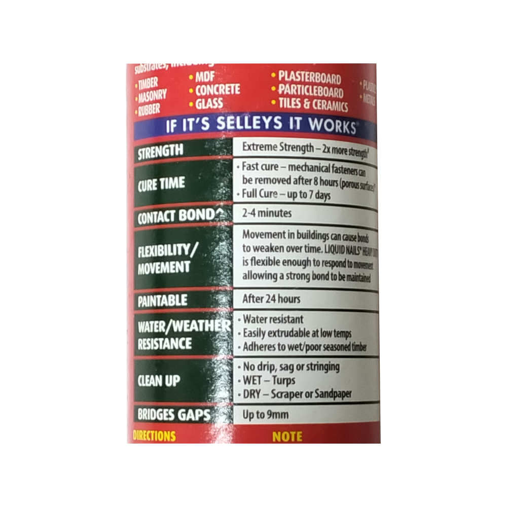 Selleys Liquid Nails Heavy Duty is an advanced, high-performance construction adhesive designed to deliver extreme strength and durability. It is engineered to provide a 2x stronger bond in half the time compared to standard Liquid Nails. This versatile adhesive is suitable for both interior and exterior applications and works on a wide variety of surfaces, including non-porous materials.