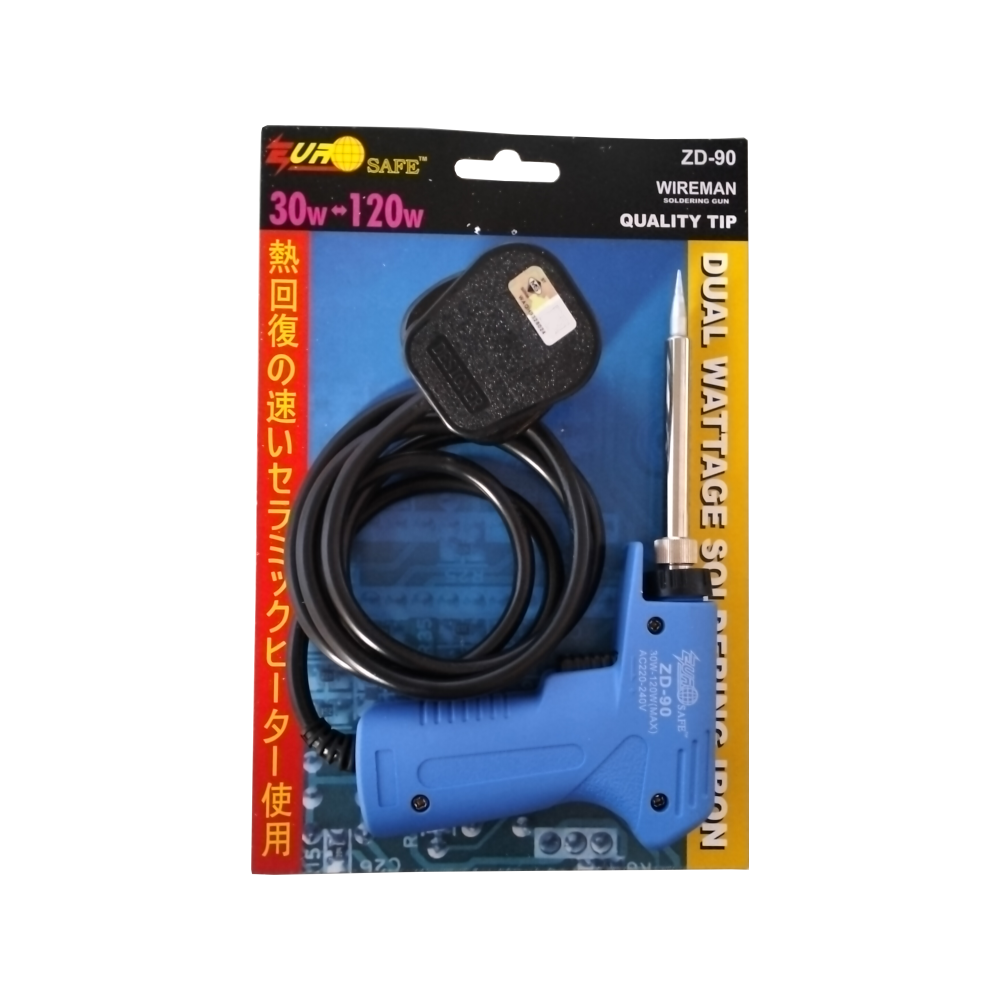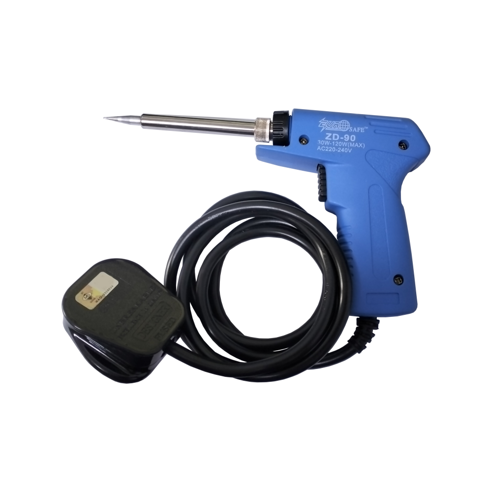 The Eurosafe ZD-90 is a high-performance, dual-wattage soldering gun designed for precision and power. This gun-type iron is ideal for users who require rapid heating for heavier joints while maintaining the ability to perform delicate electronic work. It features a blue ergonomic body and is certified by SIRIM for safety and quality assurance.