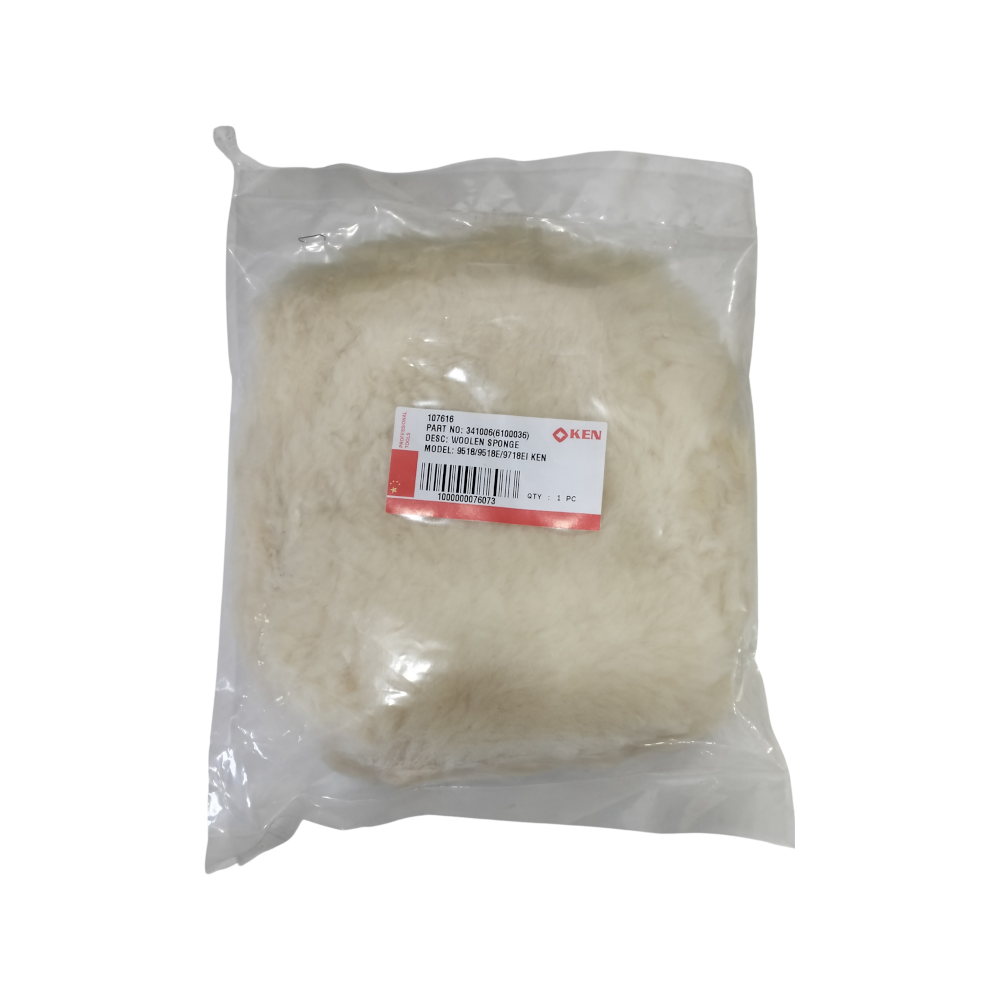 This product is a genuine spare part for the KEN 9718EI series power polisher, specifically a Woolen Sponge or Wool Buffing Pad. It is used for fine finishing, polishing, and buffing applications, typically on vehicles, metals, or other surfaces requiring a high-gloss finish.
