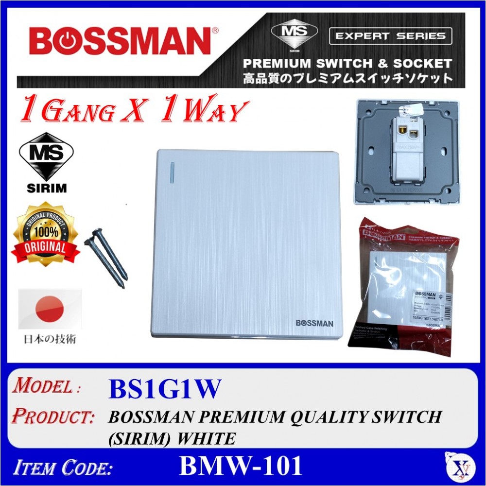 This is an electrical wall switch from the BOSS MAN brand, part of their Premium Quality Switch line. It features a sleek, contemporary design and is certified for safety and quality.