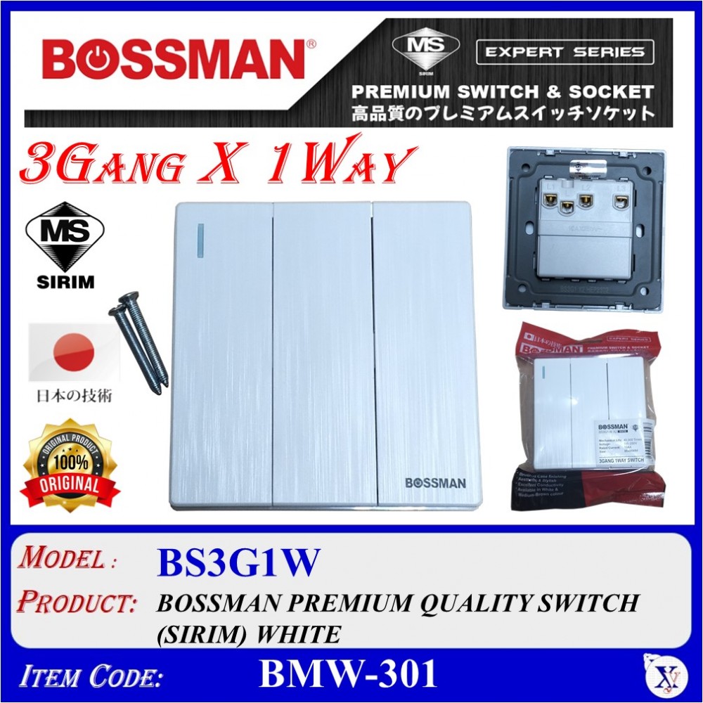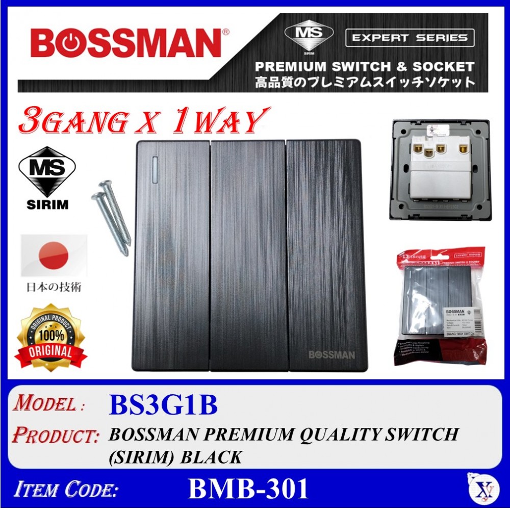BOSSMAN PREMIUM QUALITY SWITCH (SIRIM) 3Gang X 1Way (BLACK / WHITE)