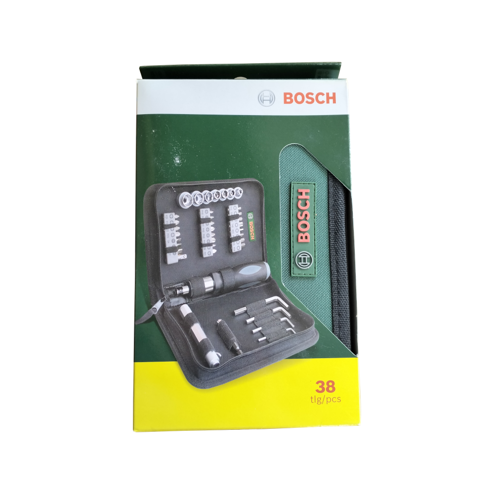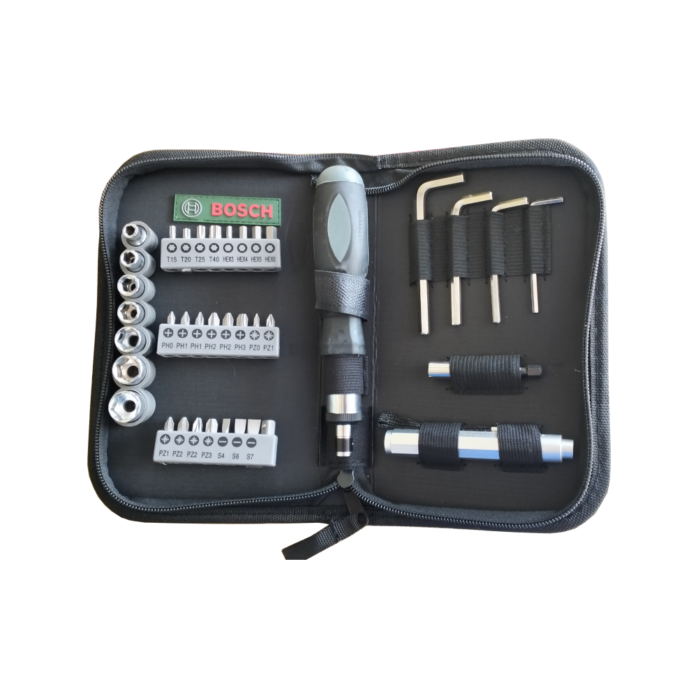 • 38 Piece screwdriver bit set includes a range of Phillips, Pozidriv, Hex, slotted and Torx bits as well as nutsetters and adaptor, torch and universal bit holder