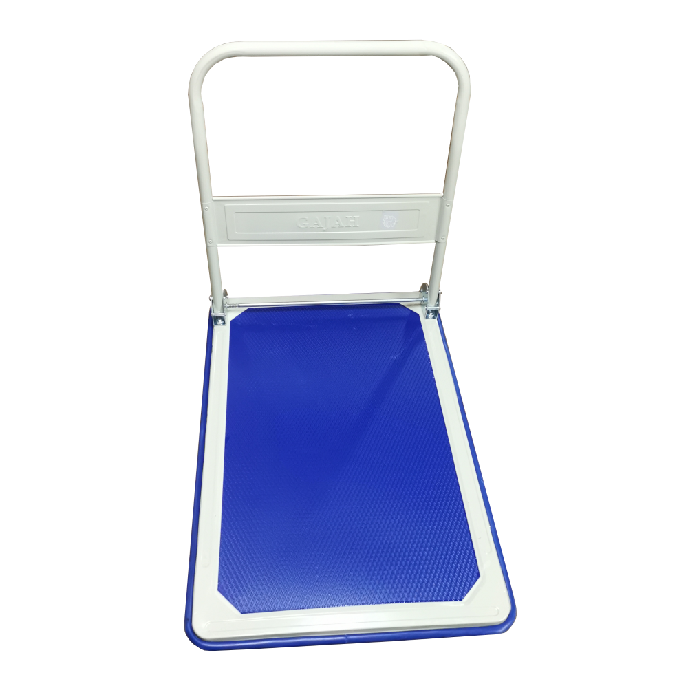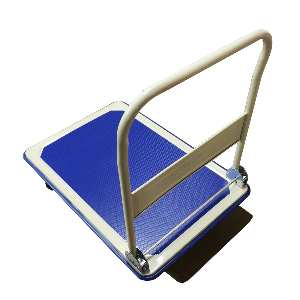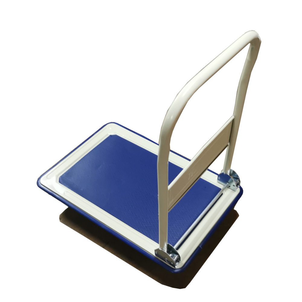 These are two models of a Metal Platform Hand Trolley with Rubber Wheels, designed for moving goods in commercial or home settings. Both feature a blue, non-slip deck and a white tubular handle that folds flat for compact storage.